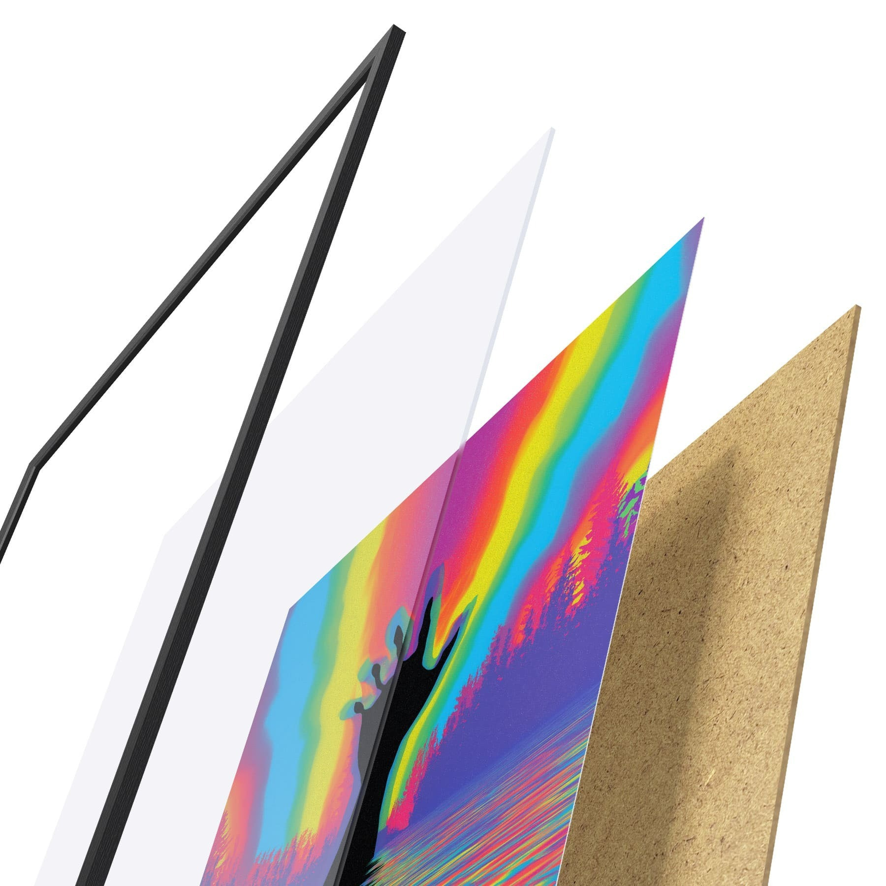 Le poster se compose d'un cadre, d'un plexiglas, d'une image imprimée et d'un support en aggloméré. Le poster peut être immédiatement accroché au mur grâce aux fixations au dos.