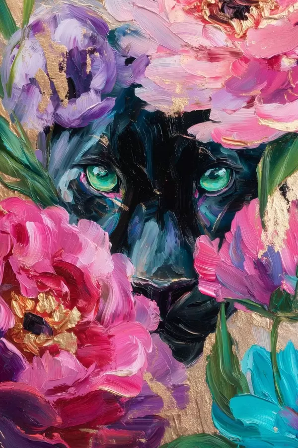 Affiche une panthère noire jette un œil parmi les pivoines f47936