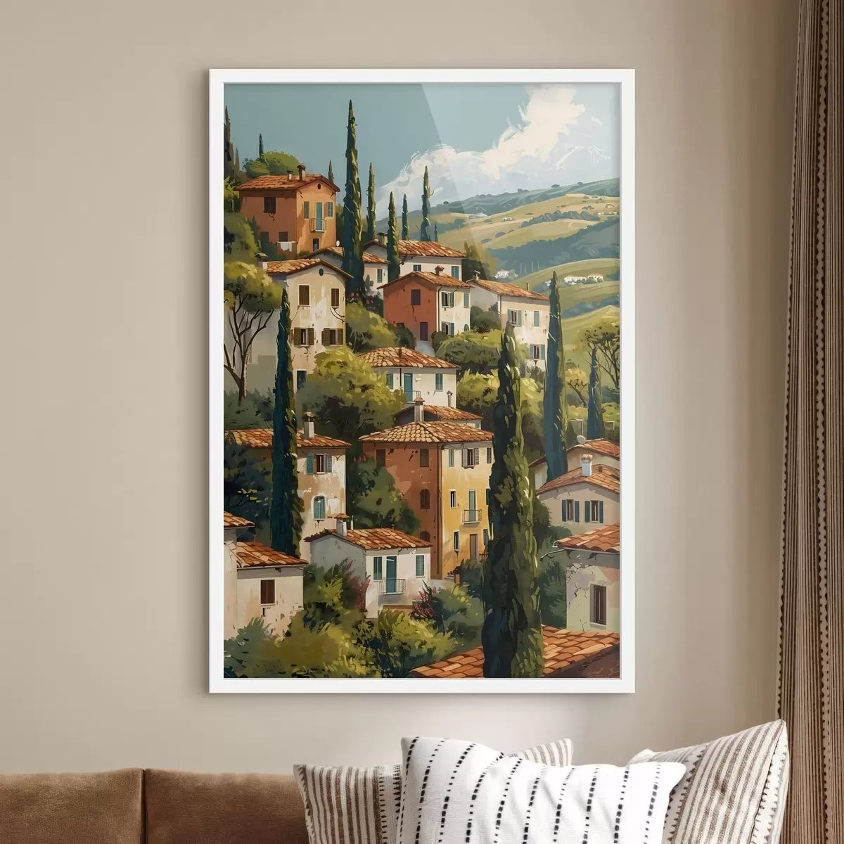 Affiche village méditerranéen à flanc de colline, maisons aux tons chauds empilées les unes sur les autres avec des toits en terre cuite f47950