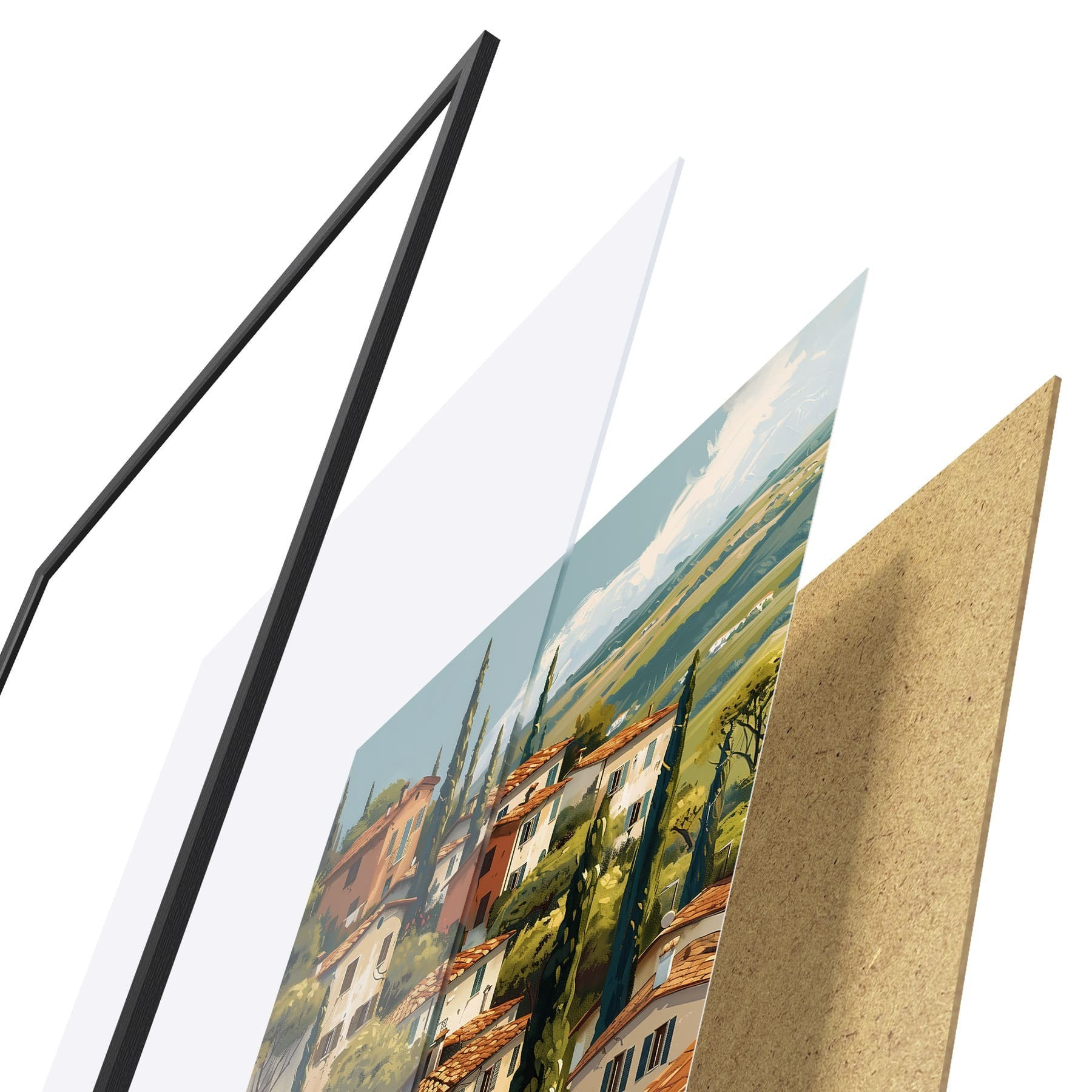 Le poster se compose d'un cadre, d'un plexiglas, d'une image imprimée et d'un support en aggloméré. Le poster peut être immédiatement accroché au mur grâce aux fixations au dos.