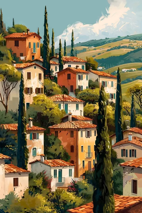 Affiche village méditerranéen à flanc de colline, maisons aux tons chauds empilées les unes sur les autres avec des toits en terre cuite f47950