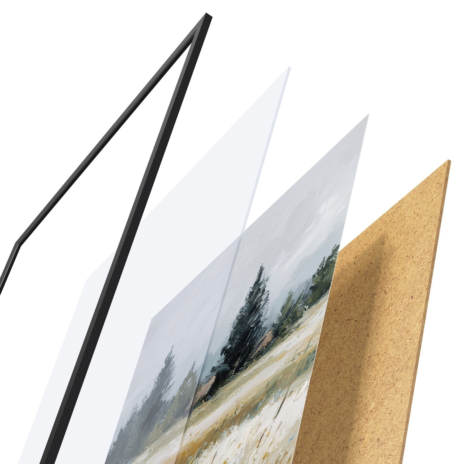 Le poster se compose d'un cadre, d'un plexiglas, d'une image imprimée et d'un support en aggloméré. Le poster peut être immédiatement accroché au mur grâce aux fixations au dos.