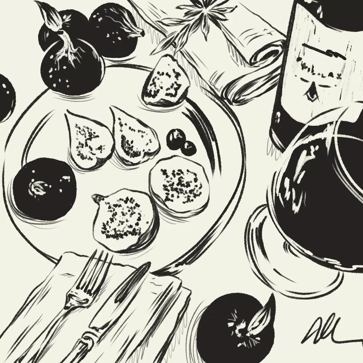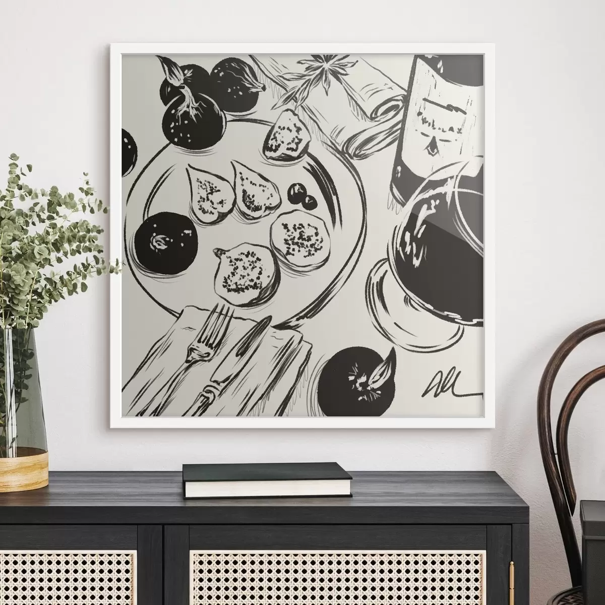 Affiche Esquisse en noir et blanc d'une table avec des fruits et un verre Non f48030