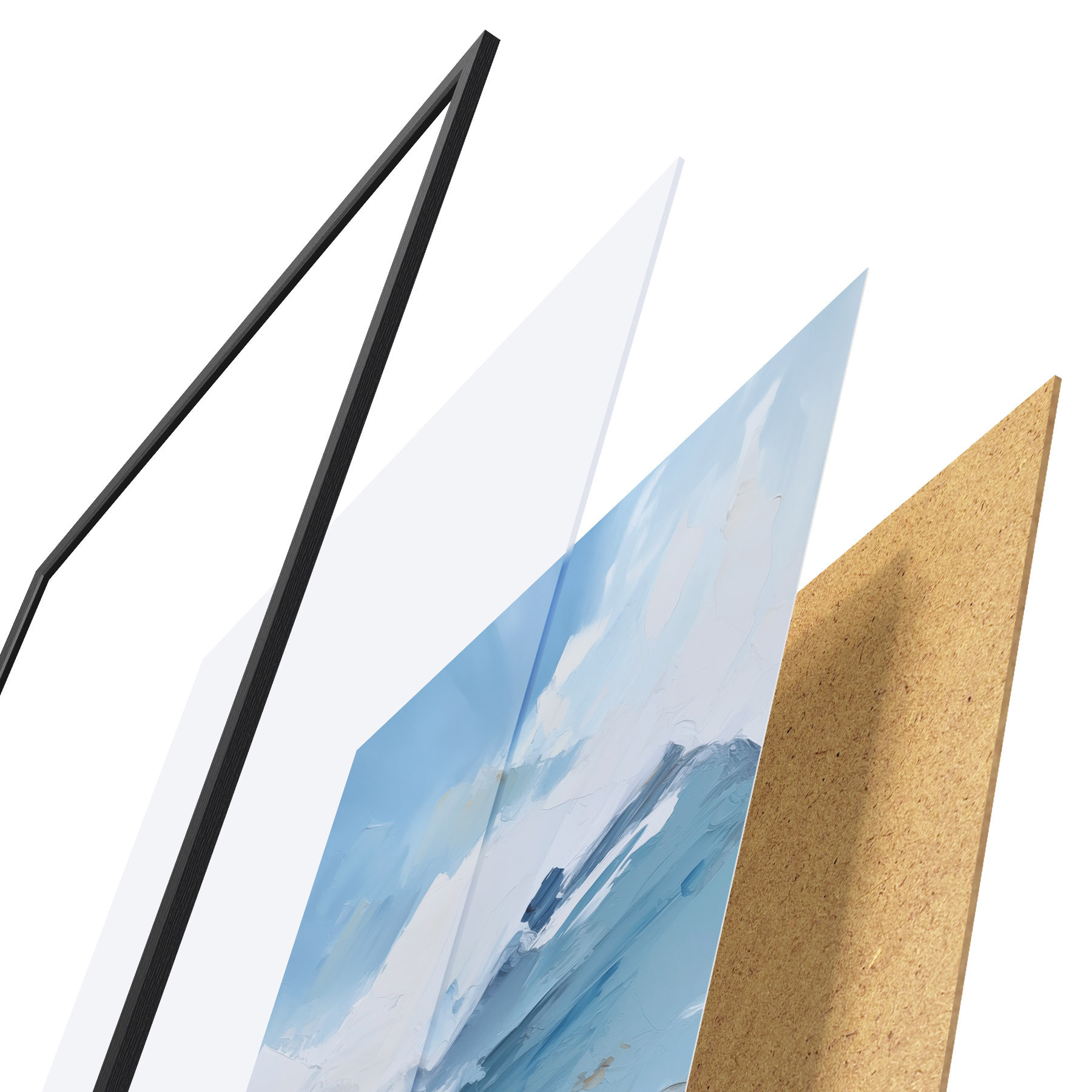 Le poster se compose d'un cadre, d'un plexiglas, d'une image imprimée et d'un support en aggloméré. Le poster peut être immédiatement accroché au mur grâce aux fixations au dos.