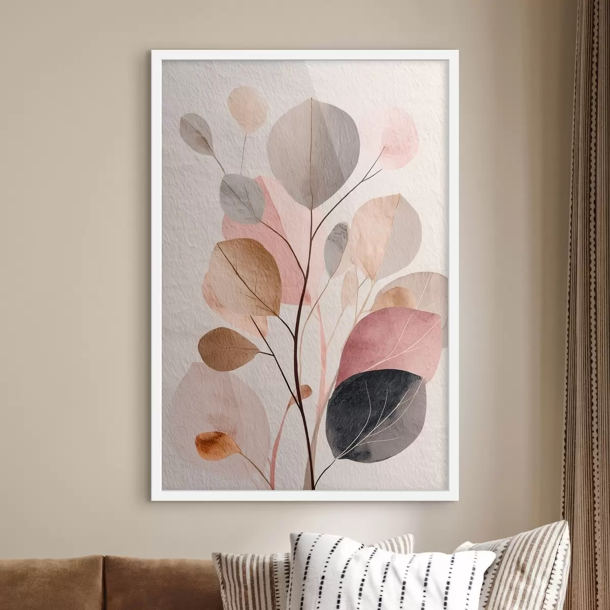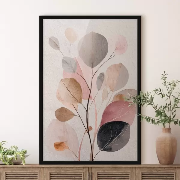 Affiche Branche abstraite aux feuilles arrondies, dans des tons chauds de beige et de corail f48187