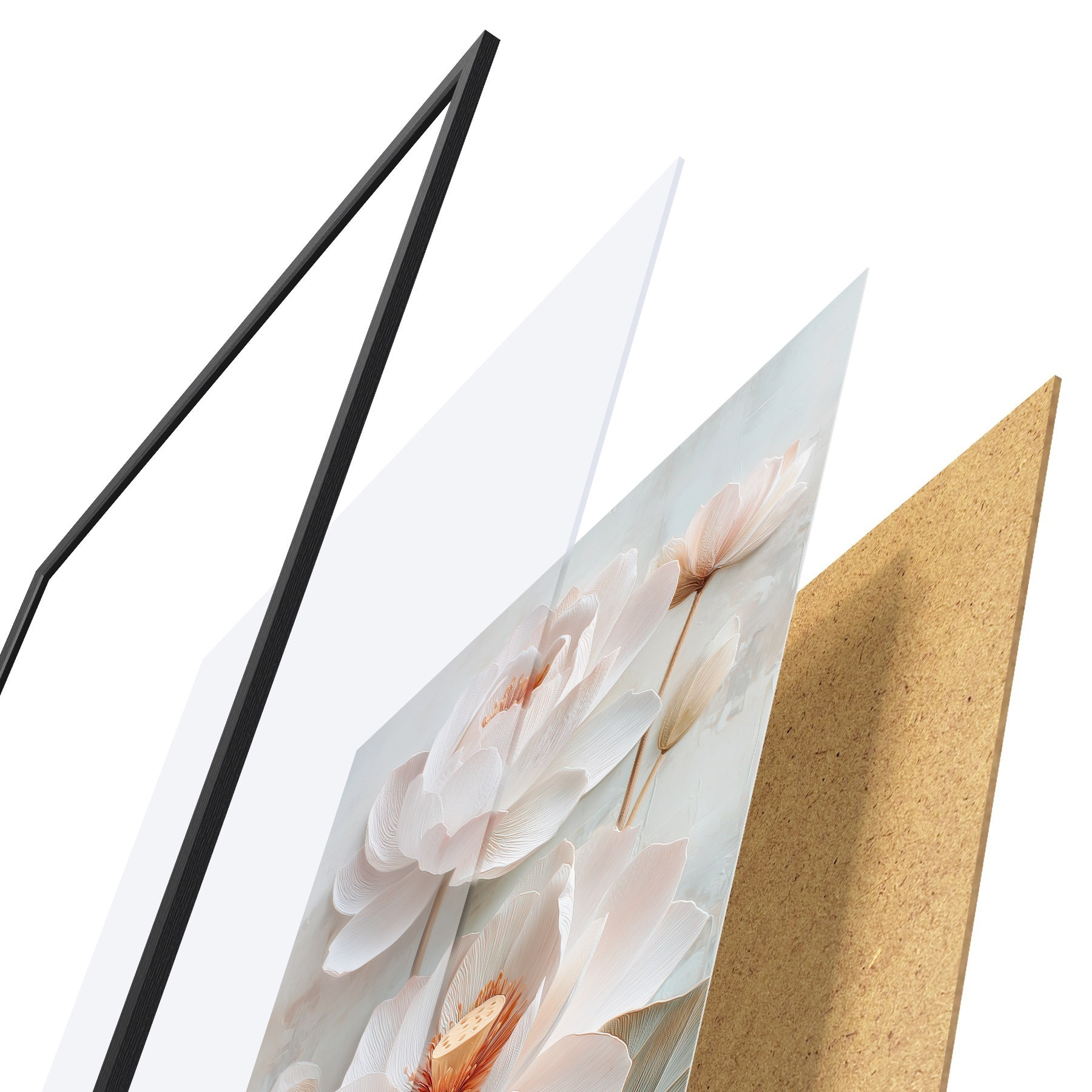 Le poster se compose d'un cadre, d'un plexiglas, d'une image imprimée et d'un support en aggloméré. Le poster peut être immédiatement accroché au mur grâce aux fixations au dos.