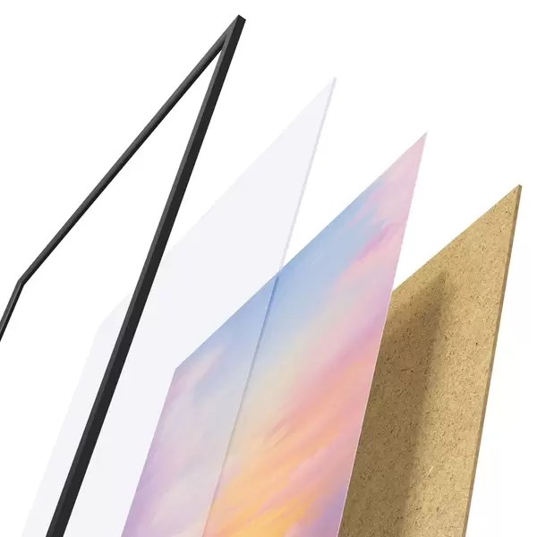 Le poster se compose d'un cadre, d'un plexiglas, d'une image imprimée et d'un support en aggloméré. Le poster peut être immédiatement accroché au mur grâce aux fixations au dos.