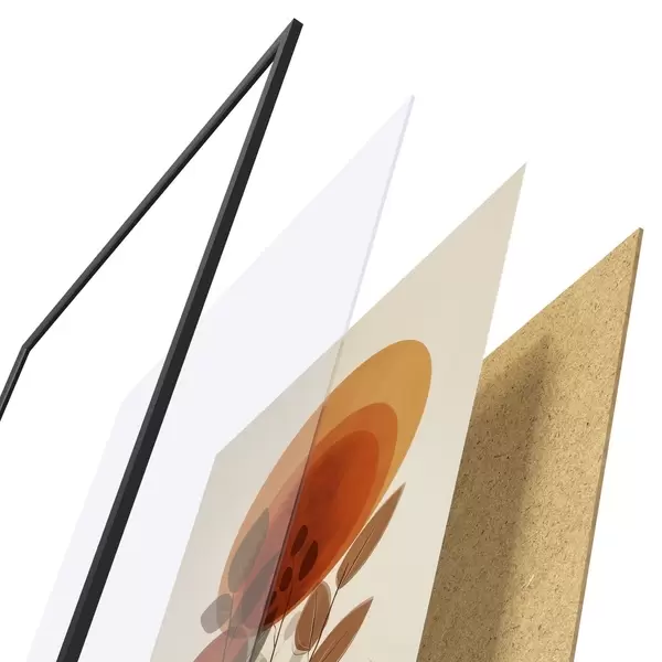 Le poster se compose d'un cadre, d'un plexiglas, d'une image imprimée et d'un support en aggloméré. Le poster peut être immédiatement accroché au mur grâce aux fixations au dos.