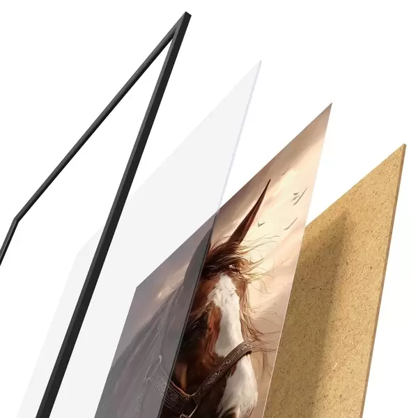 Le poster se compose d'un cadre, d'un plexiglas, d'une image imprimée et d'un support en aggloméré. Le poster peut être immédiatement accroché au mur grâce aux fixations au dos.