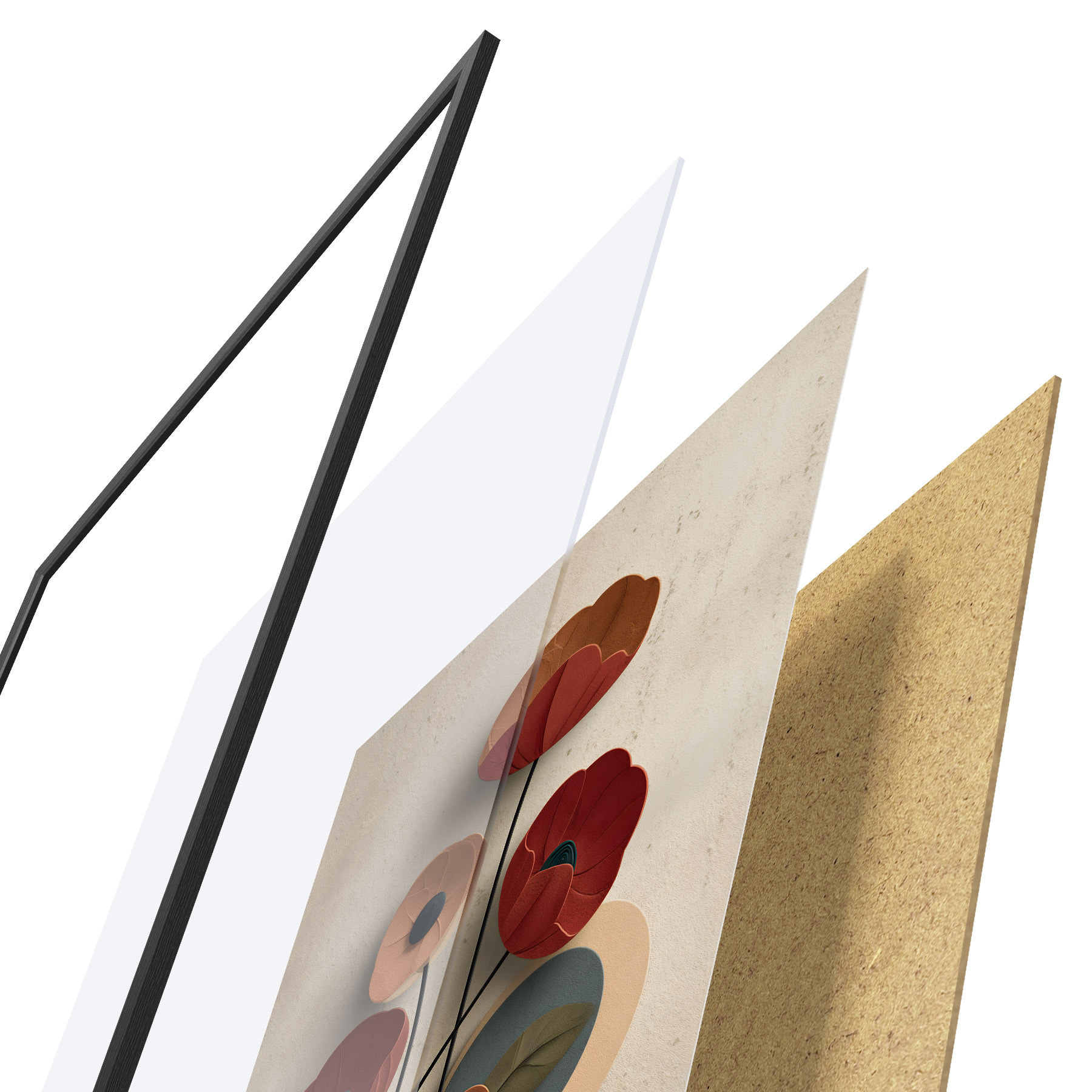 Le poster se compose d'un cadre, d'un plexiglas, d'une image imprimée et d'un support en aggloméré. Le poster peut être immédiatement accroché au mur grâce aux fixations au dos.