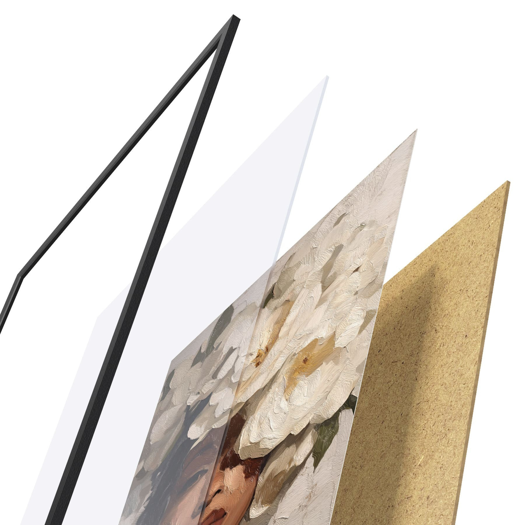 Le poster se compose d'un cadre, d'un plexiglas, d'une image imprimée et d'un support en aggloméré. Le poster peut être immédiatement accroché au mur grâce aux fixations au dos.