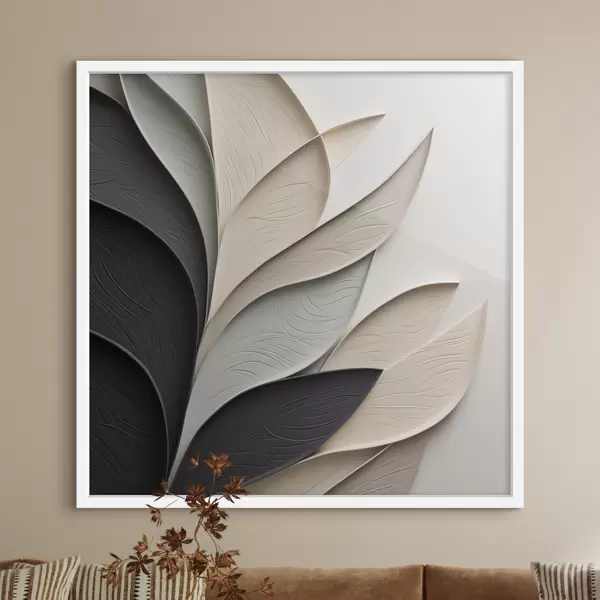 Affiche Composition abstraite de feuilles superposées, de formes courbes en noir, blanc et beige, œuvre d'art texturée f48382