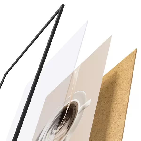 Le poster se compose d'un cadre, d'un plexiglas, d'une image imprimée et d'un support en aggloméré. Le poster peut être immédiatement accroché au mur grâce aux fixations au dos.