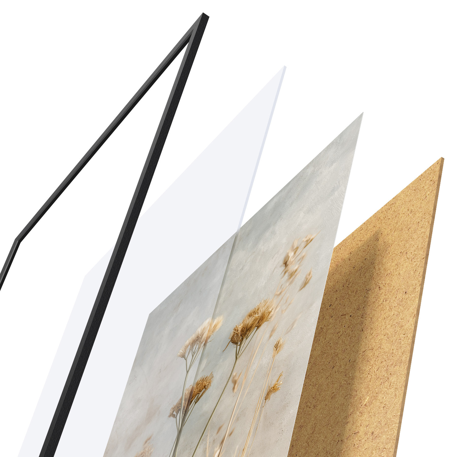Le poster se compose d'un cadre, d'un plexiglas, d'une image imprimée et d'un support en aggloméré. Le poster peut être immédiatement accroché au mur grâce aux fixations au dos.