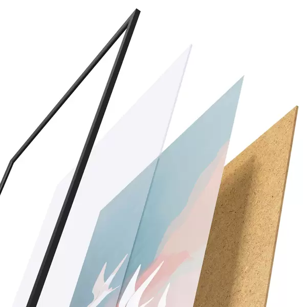 Le poster se compose d'un cadre, d'un plexiglas, d'une image imprimée et d'un support en aggloméré. Le poster peut être immédiatement accroché au mur grâce aux fixations au dos.