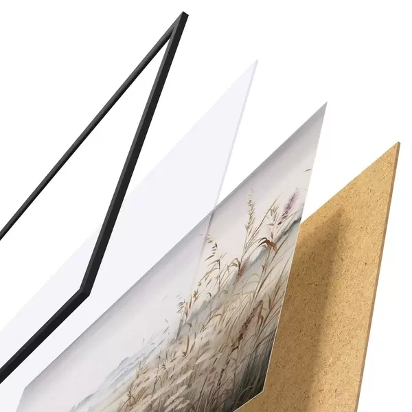 Le poster se compose d'un cadre, d'un plexiglas, d'une image imprimée et d'un support en aggloméré. Le poster peut être immédiatement accroché au mur grâce aux fixations au dos.