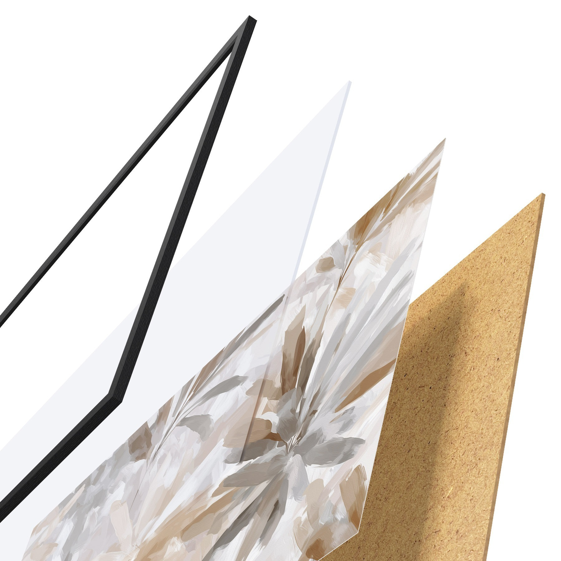 Le poster se compose d'un cadre, d'un plexiglas, d'une image imprimée et d'un support en aggloméré. Le poster peut être immédiatement accroché au mur grâce aux fixations au dos.