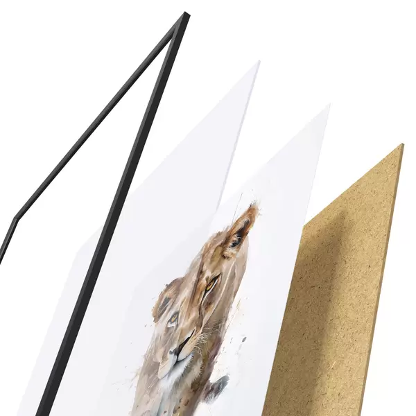 Le poster se compose d'un cadre, d'un plexiglas, d'une image imprimée et d'un support en aggloméré. Le poster peut être immédiatement accroché au mur grâce aux fixations au dos.