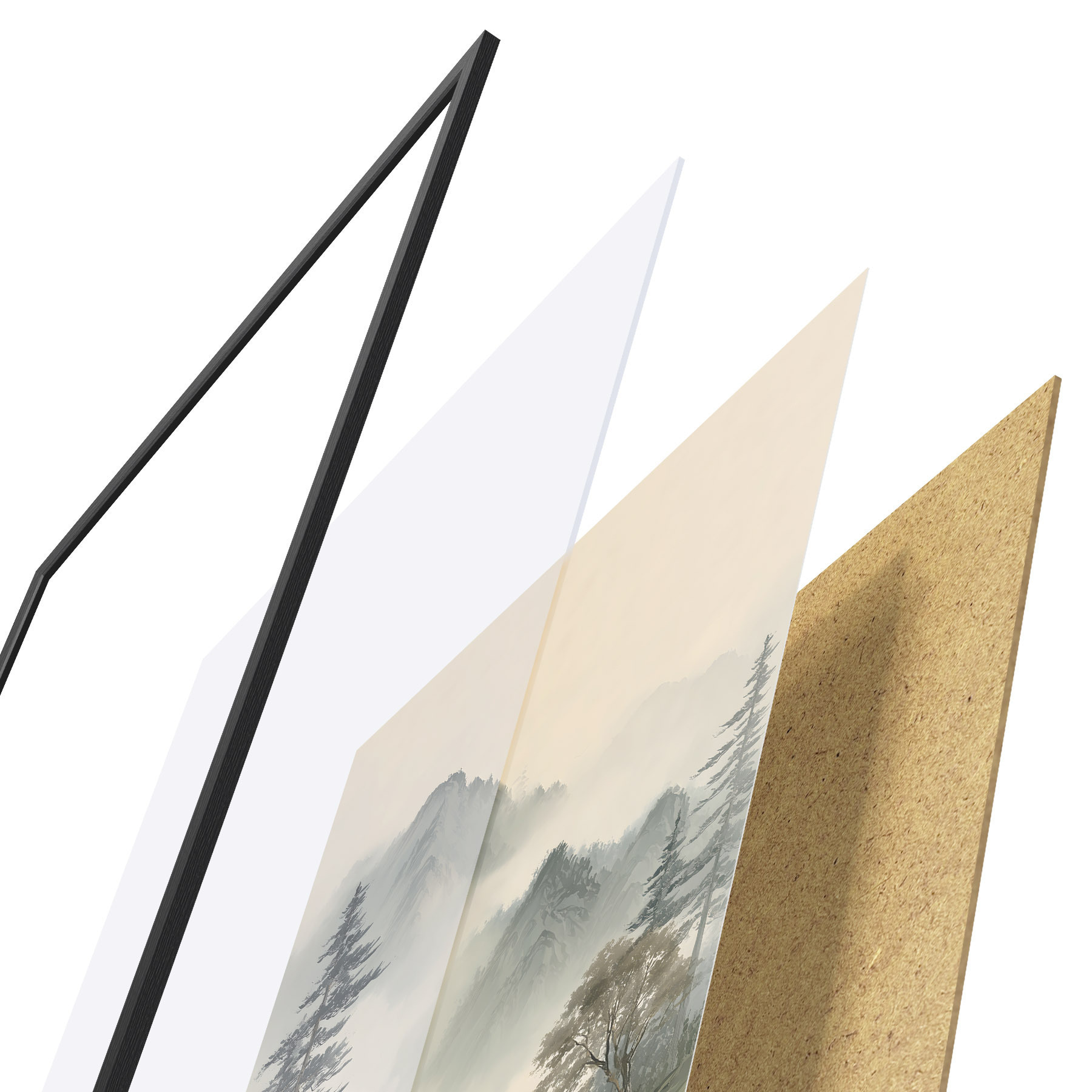 Le poster se compose d'un cadre, d'un plexiglas, d'une image imprimée et d'un support en aggloméré. Le poster peut être immédiatement accroché au mur grâce aux fixations au dos.