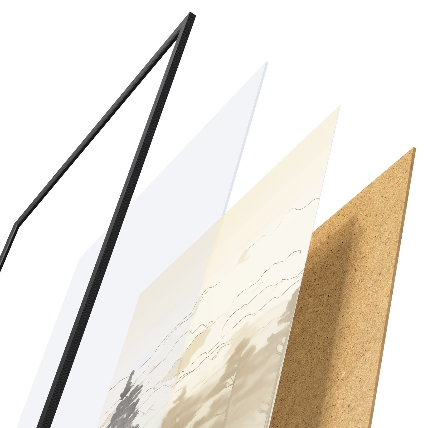 Le poster se compose d'un cadre, d'un plexiglas, d'une image imprimée et d'un support en aggloméré. Le poster peut être immédiatement accroché au mur grâce aux fixations au dos.