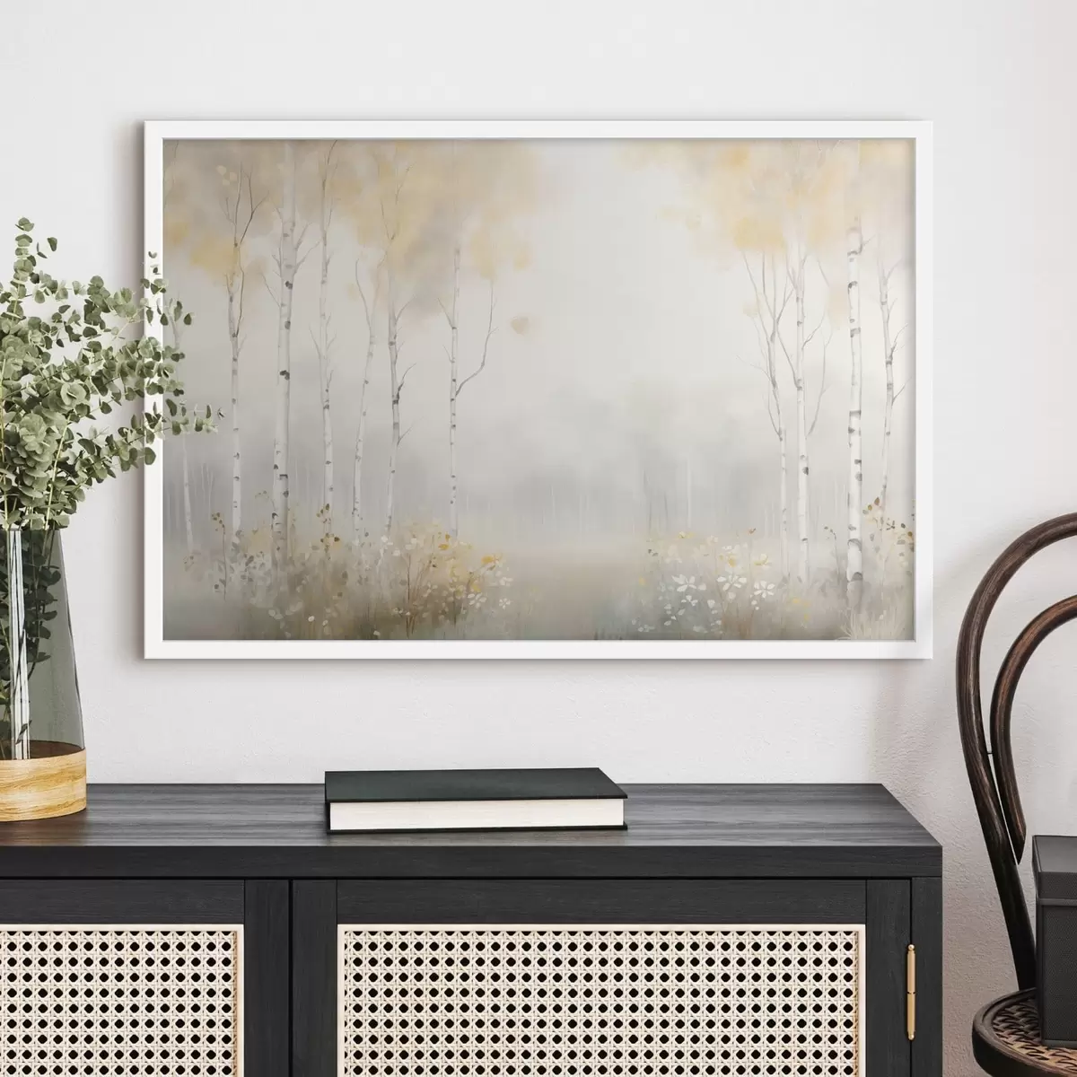 Affiche Une forêt d'arbres élancés dans la brume, dans des tons clairs et doux f48623