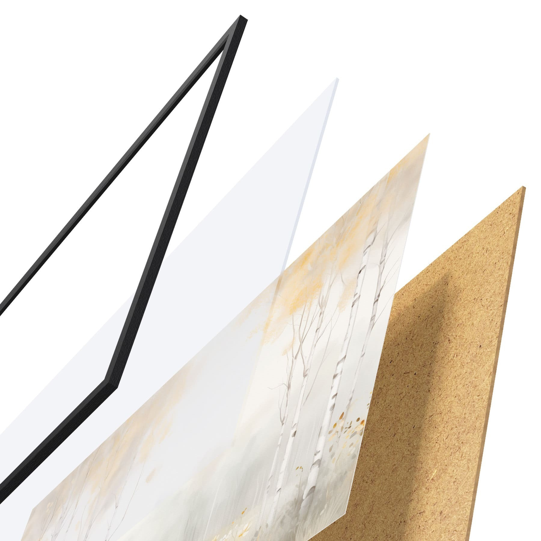 Le poster se compose d'un cadre, d'un plexiglas, d'une image imprimée et d'un support en aggloméré. Le poster peut être immédiatement accroché au mur grâce aux fixations au dos.