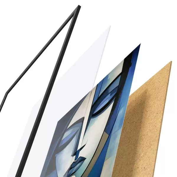 Le poster se compose d'un cadre, d'un plexiglas, d'une image imprimée et d'un support en aggloméré. Le poster peut être immédiatement accroché au mur grâce aux fixations au dos.