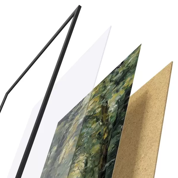 Le poster se compose d'un cadre, d'un plexiglas, d'une image imprimée et d'un support en aggloméré. Le poster peut être immédiatement accroché au mur grâce aux fixations au dos.