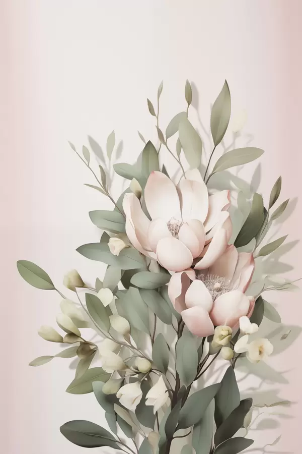 Affiche Un bouquet de fleurs aux couleurs pastel avec des feuilles d'eucalyptus, sur fond rose pâle Non f48728
