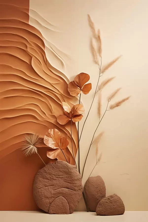 Affiche Une œuvre minimaliste composée de fleurs séchées et d'herbe de la pampa, sur un fond texturé Non f48739