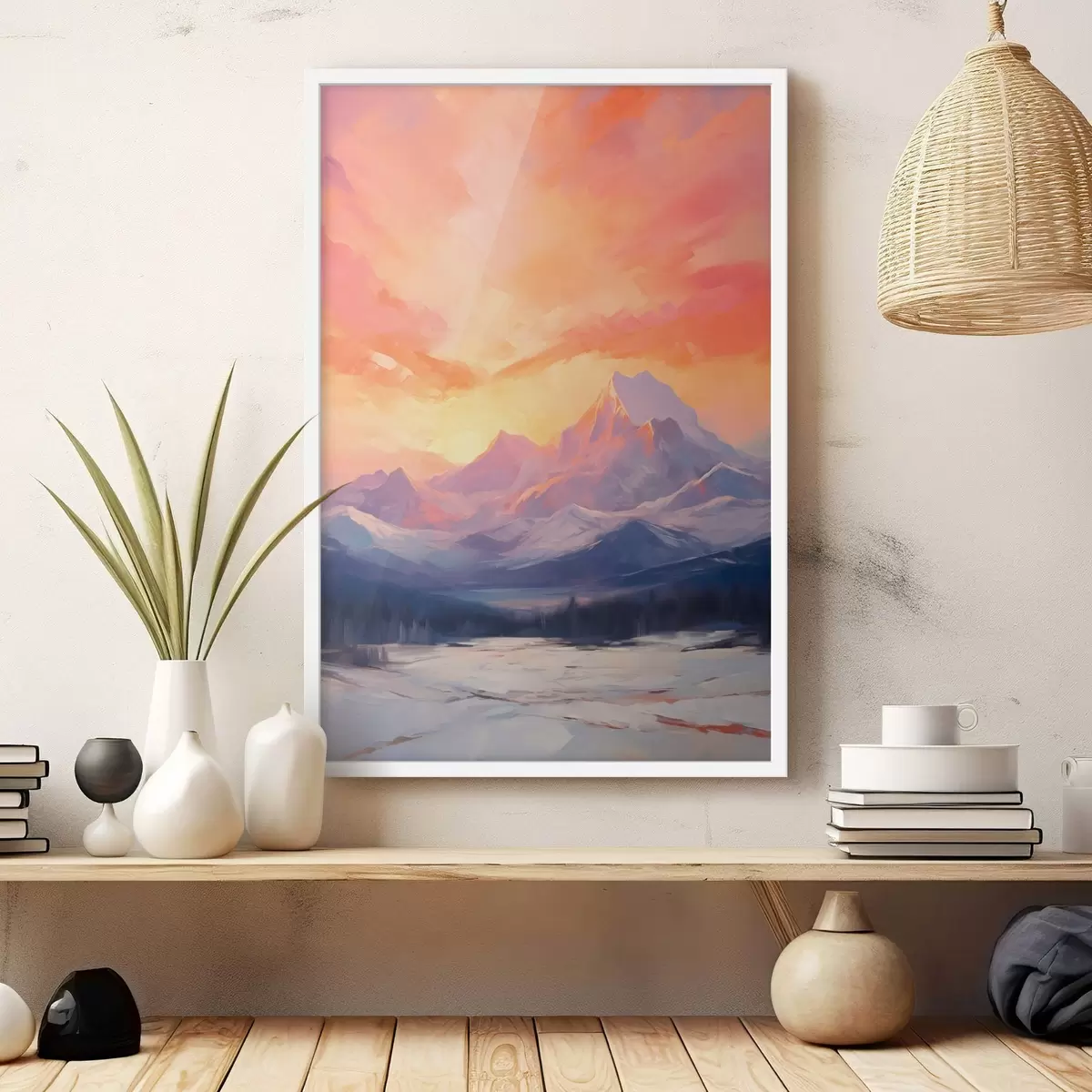 Affiche Des montagnes aux sommets enneigés sous un ciel aux teintes vives d'orange et de rose, parsemé de nuages Non f48741