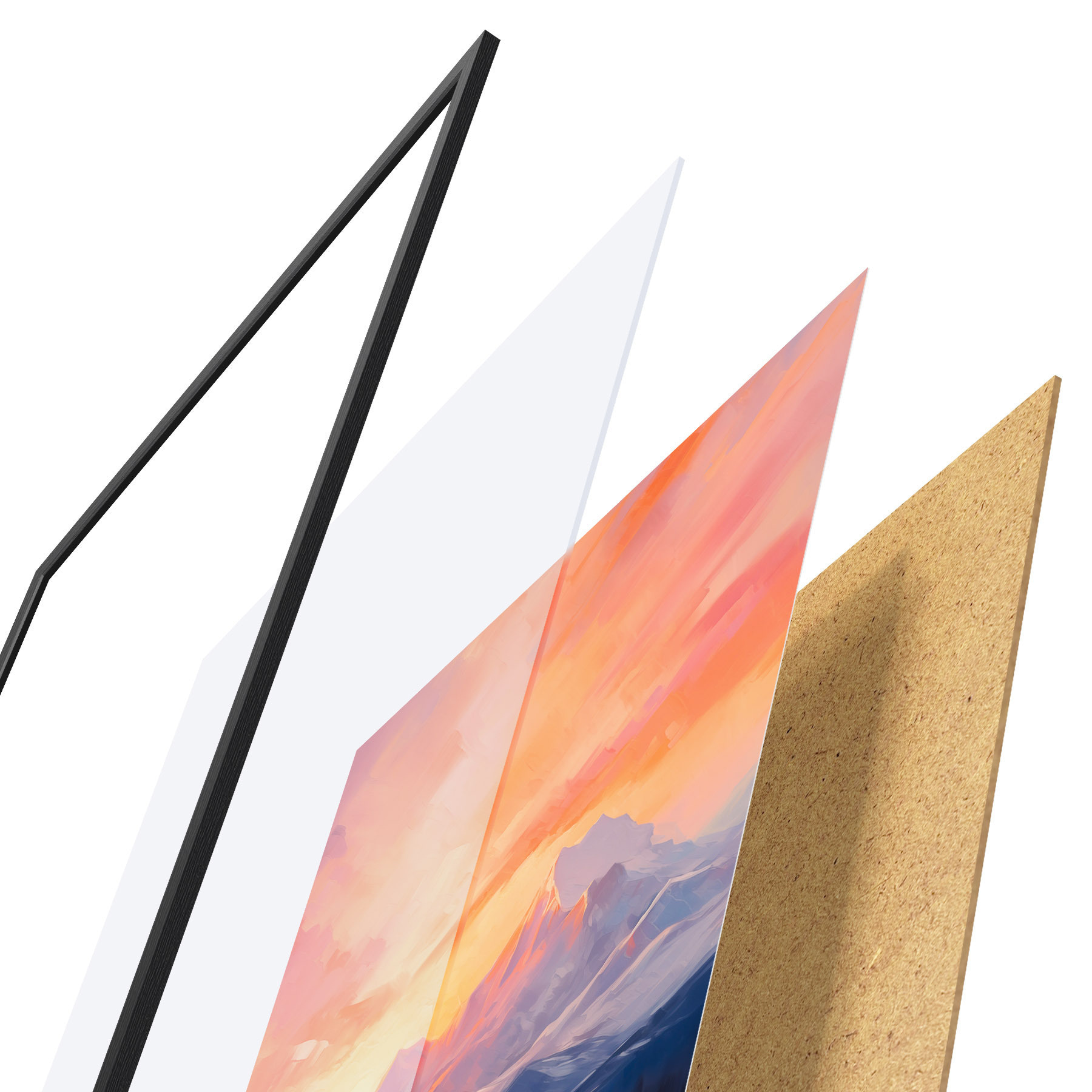 Le poster se compose d'un cadre, d'un plexiglas, d'une image imprimée et d'un support en aggloméré. Le poster peut être immédiatement accroché au mur grâce aux fixations au dos.