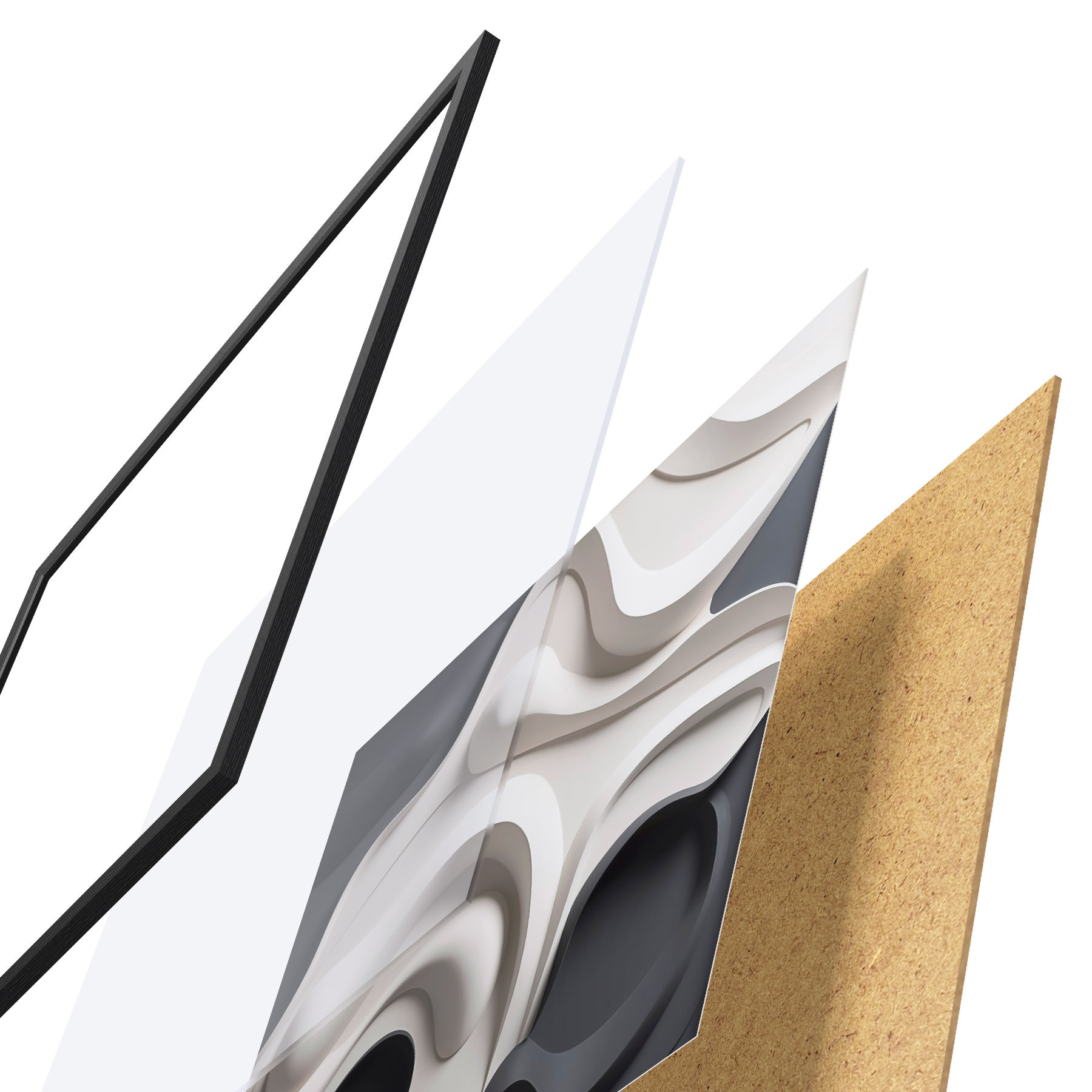 Le poster se compose d'un cadre, d'un plexiglas, d'une image imprimée et d'un support en aggloméré. Le poster peut être immédiatement accroché au mur grâce aux fixations au dos.