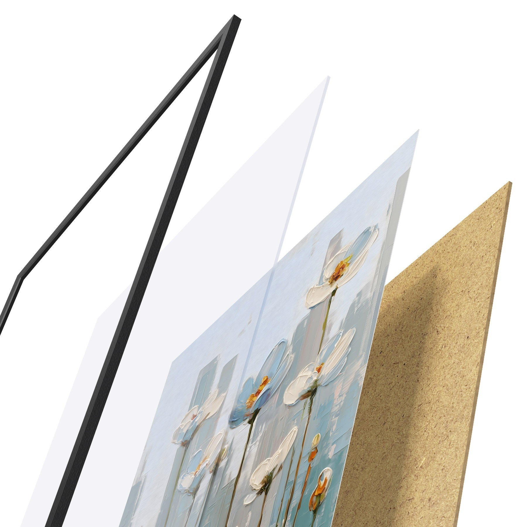 Le poster se compose d'un cadre, d'un plexiglas, d'une image imprimée et d'un support en aggloméré. Le poster peut être immédiatement accroché au mur grâce aux fixations au dos.