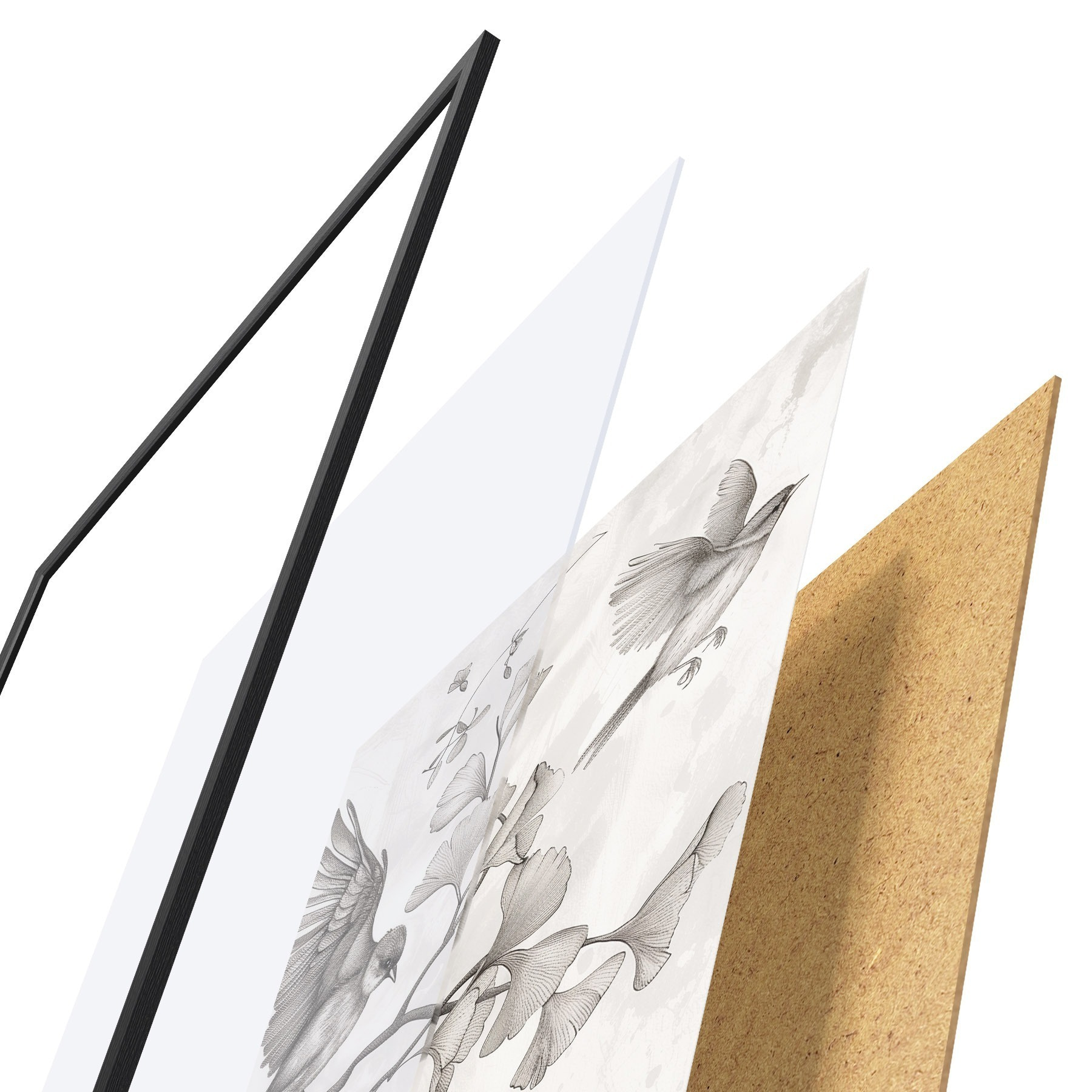 Le poster se compose d'un cadre, d'un plexiglas, d'une image imprimée et d'un support en aggloméré. Le poster peut être immédiatement accroché au mur grâce aux fixations au dos.
