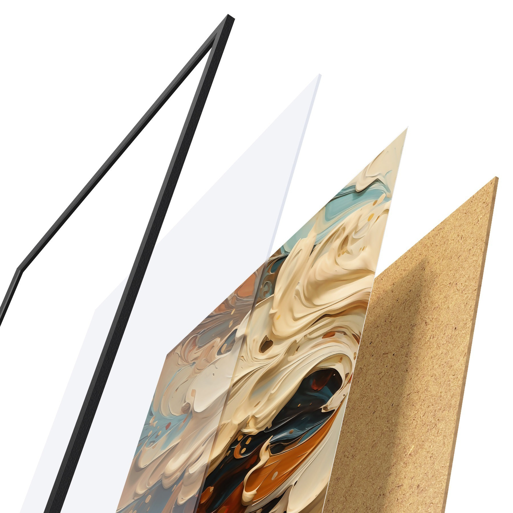 Le poster se compose d'un cadre, d'un plexiglas, d'une image imprimée et d'un support en aggloméré. Le poster peut être immédiatement accroché au mur grâce aux fixations au dos.