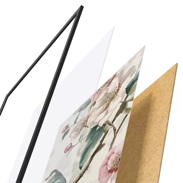 Le poster se compose d'un cadre, d'un plexiglas, d'une image imprimée et d'un support en aggloméré. Le poster peut être immédiatement accroché au mur grâce aux fixations au dos.