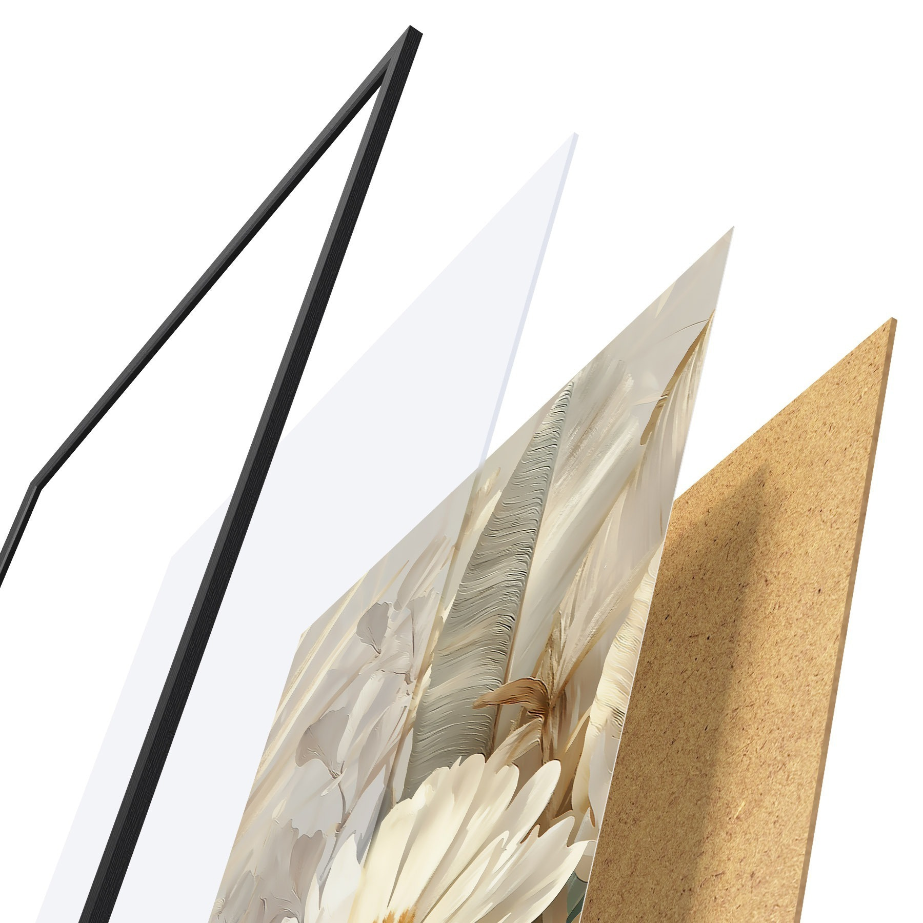 Le poster se compose d'un cadre, d'un plexiglas, d'une image imprimée et d'un support en aggloméré. Le poster peut être immédiatement accroché au mur grâce aux fixations au dos.