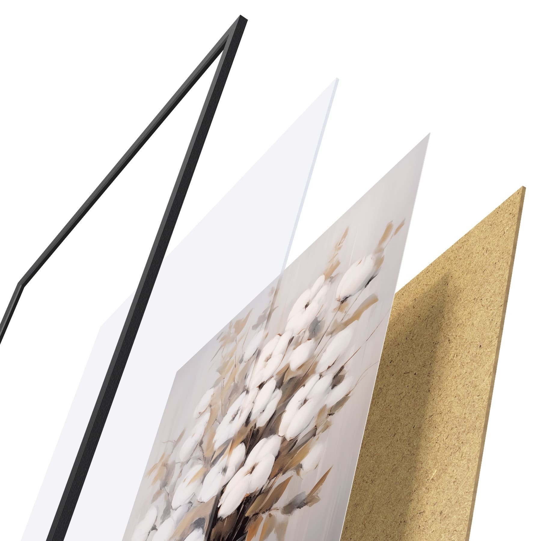 Le poster se compose d'un cadre, d'un plexiglas, d'une image imprimée et d'un support en aggloméré. Le poster peut être immédiatement accroché au mur grâce aux fixations au dos.