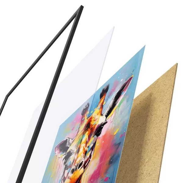 Le poster se compose d'un cadre, d'un plexiglas, d'une image imprimée et d'un support en aggloméré. Le poster peut être immédiatement accroché au mur grâce aux fixations au dos.
