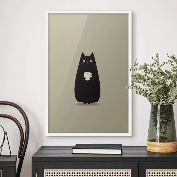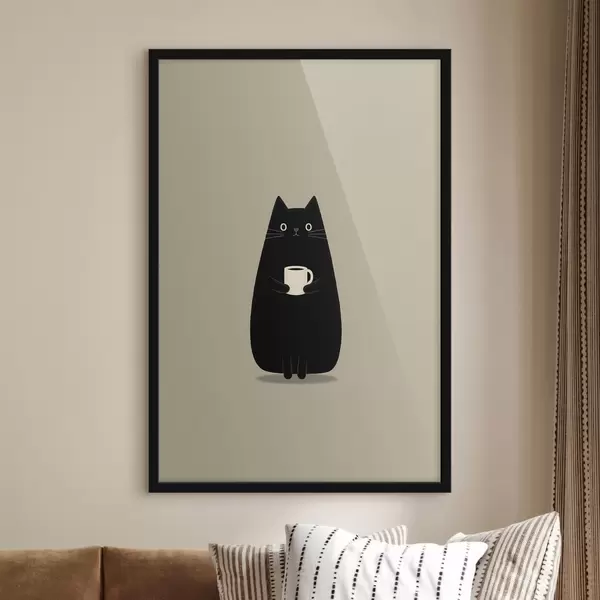 Affiche Un chat noir avec une tasse Non f49030