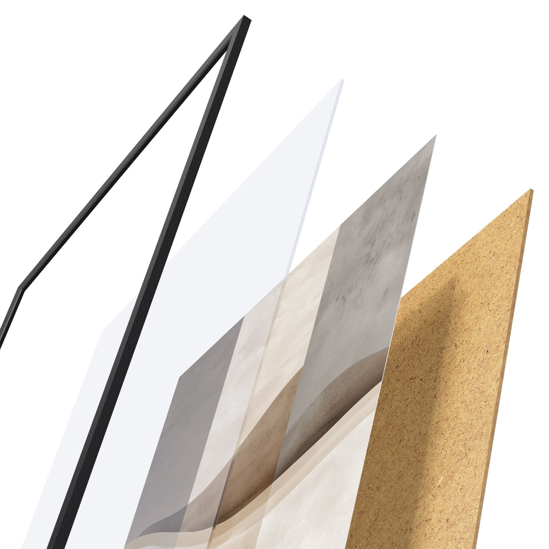 Le poster se compose d'un cadre, d'un plexiglas, d'une image imprimée et d'un support en aggloméré. Le poster peut être immédiatement accroché au mur grâce aux fixations au dos.