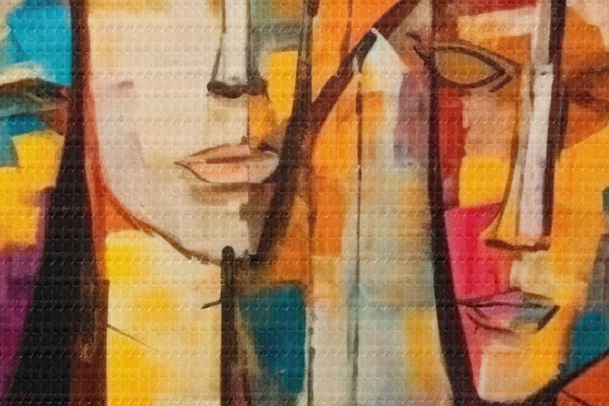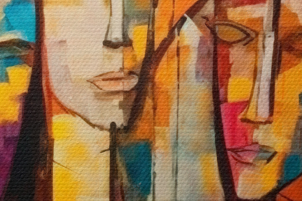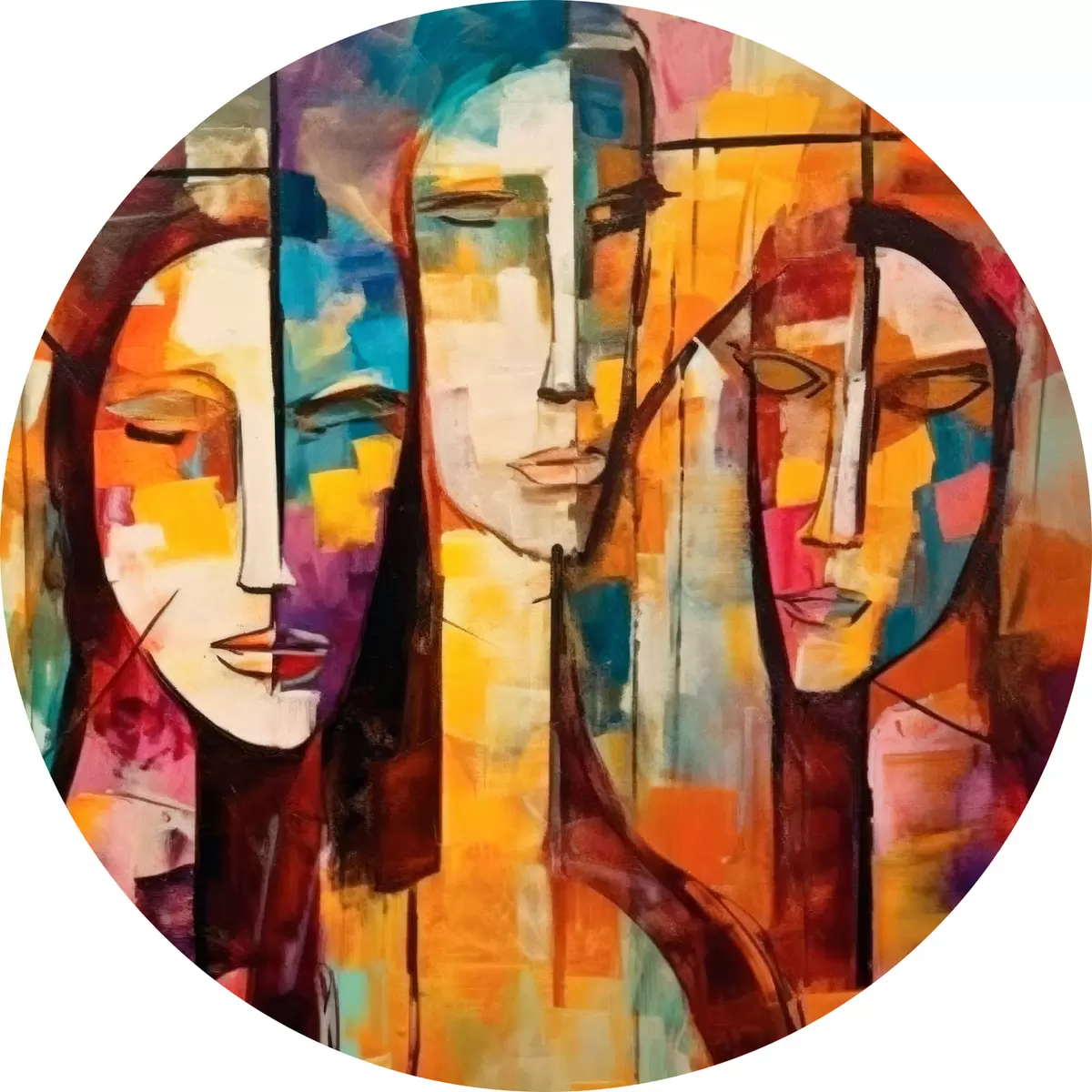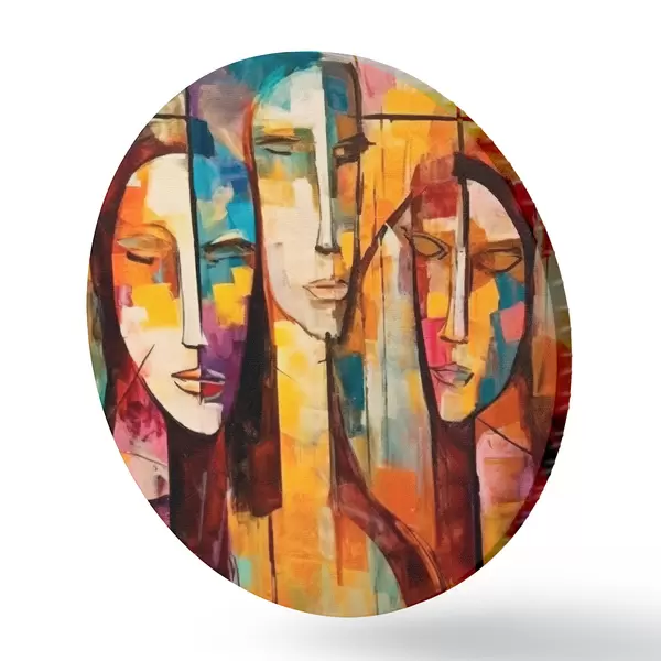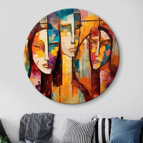 Tableaux ronds 3 visages surréalistes dans des tons orange vif r33845