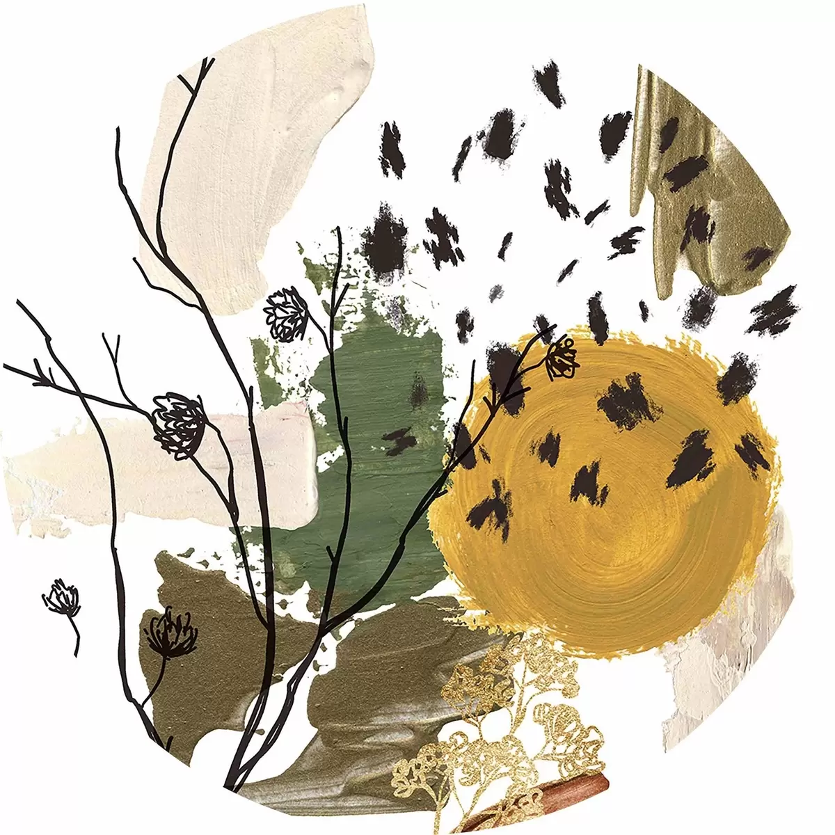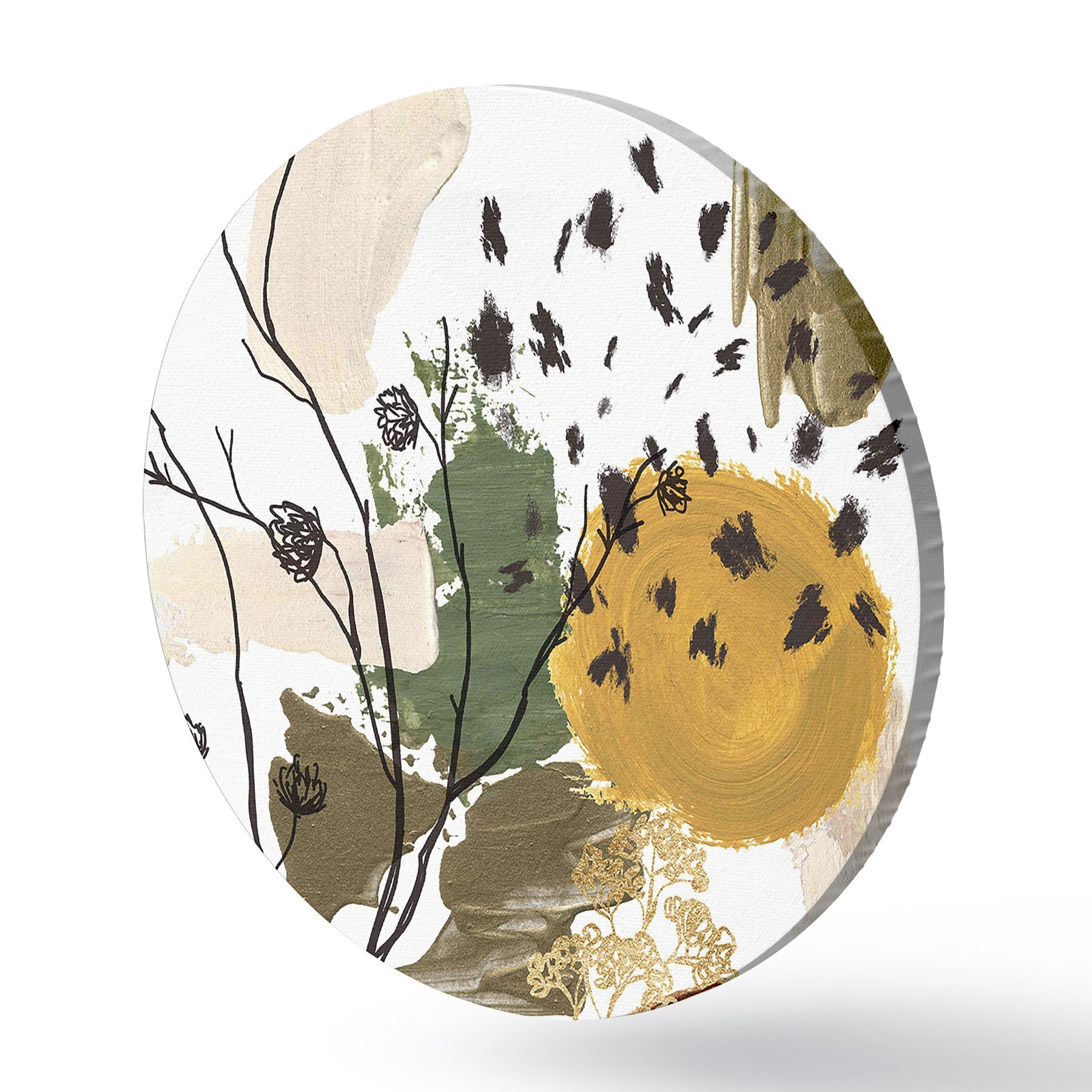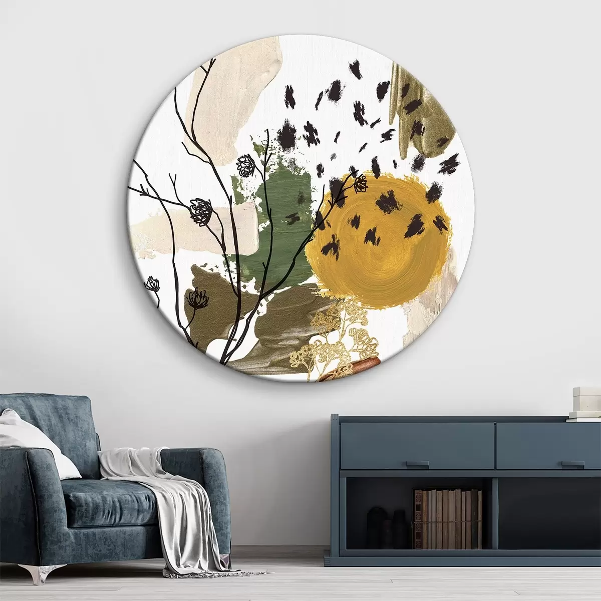 Tableaux ronds Composition d'automne en aquarelle avec des branches linéaires, des taches brunes, jaunes et vertes r35950