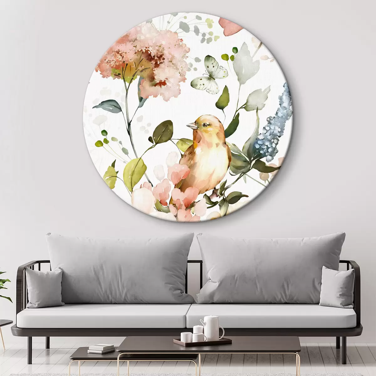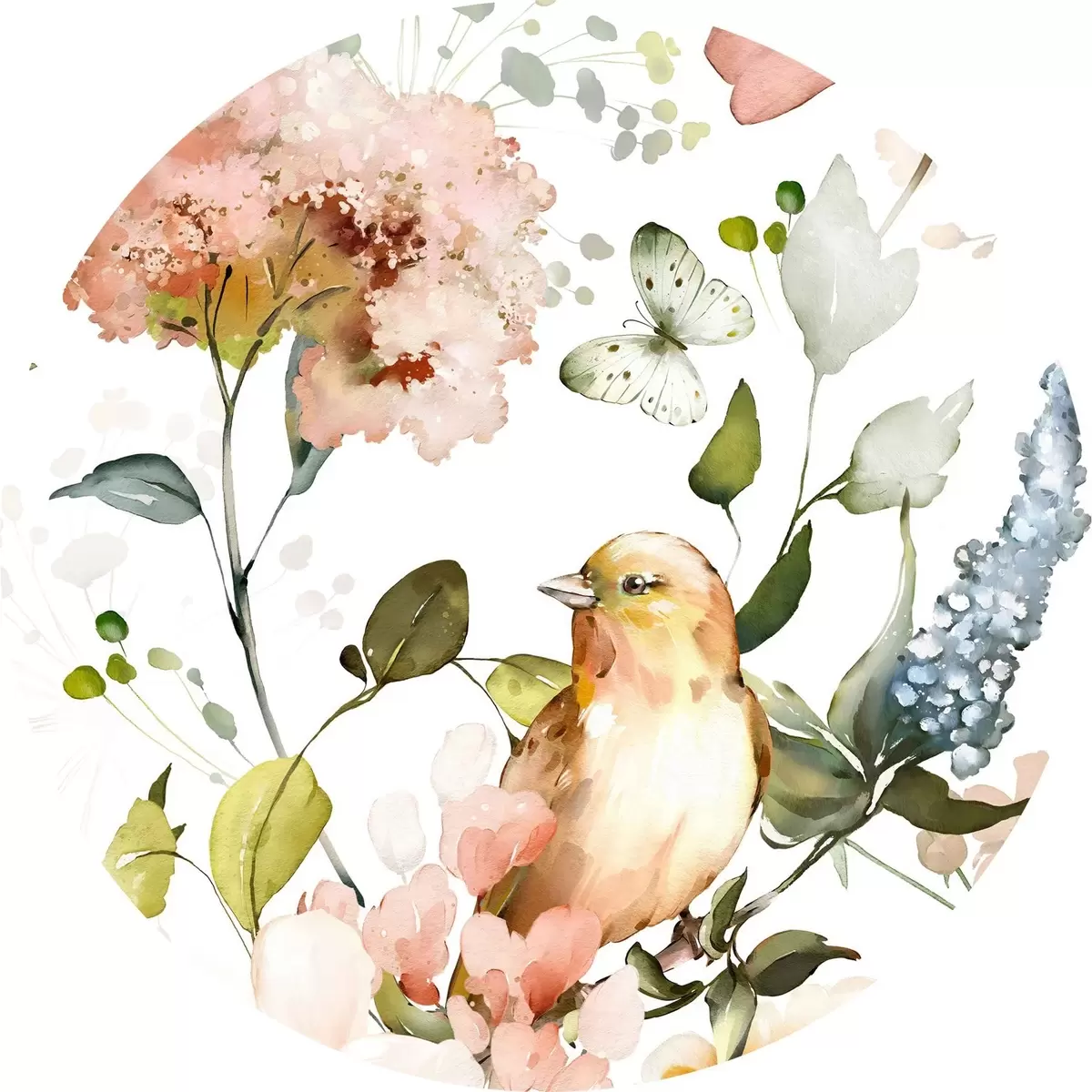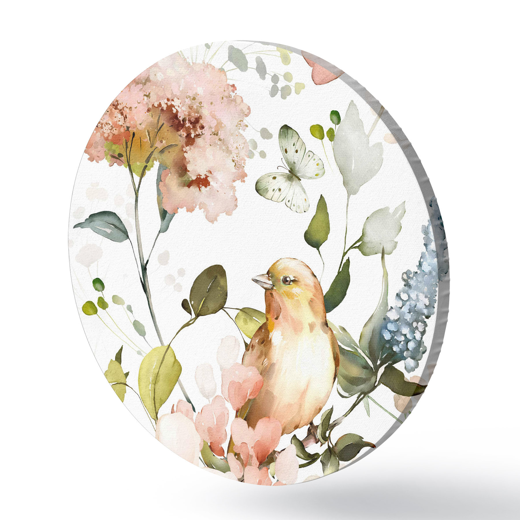 Tableaux ronds Aquarelle représentant des fleurs, des oiseaux et des papillons sur fond blanc r36153