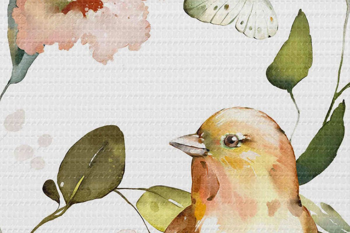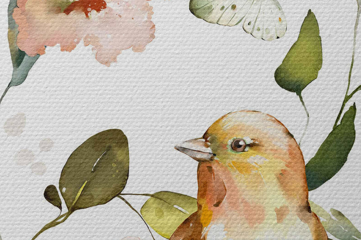 Image Aquarelle représentant des fleurs, des oiseaux et des papillons sur fond blanc Nr r36153