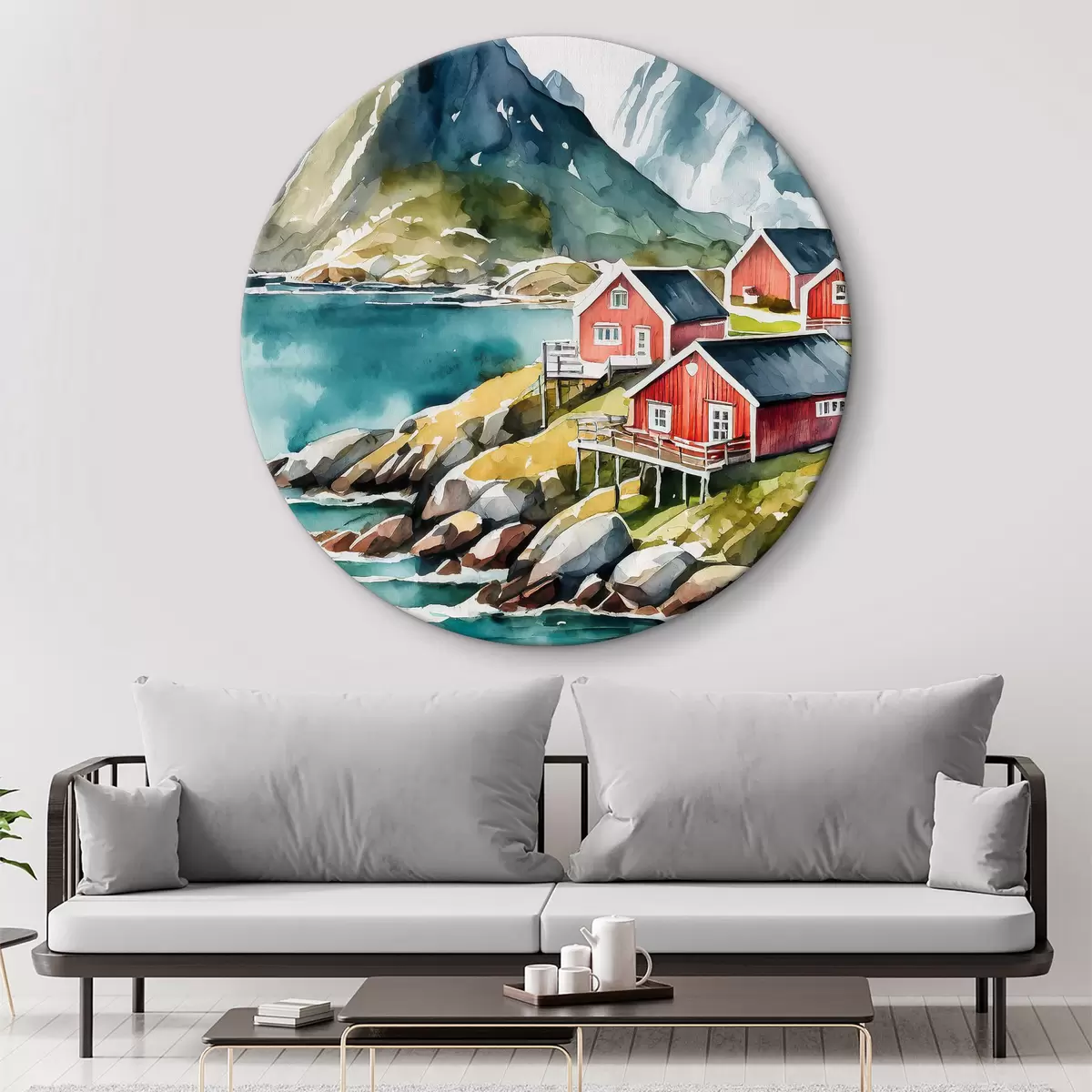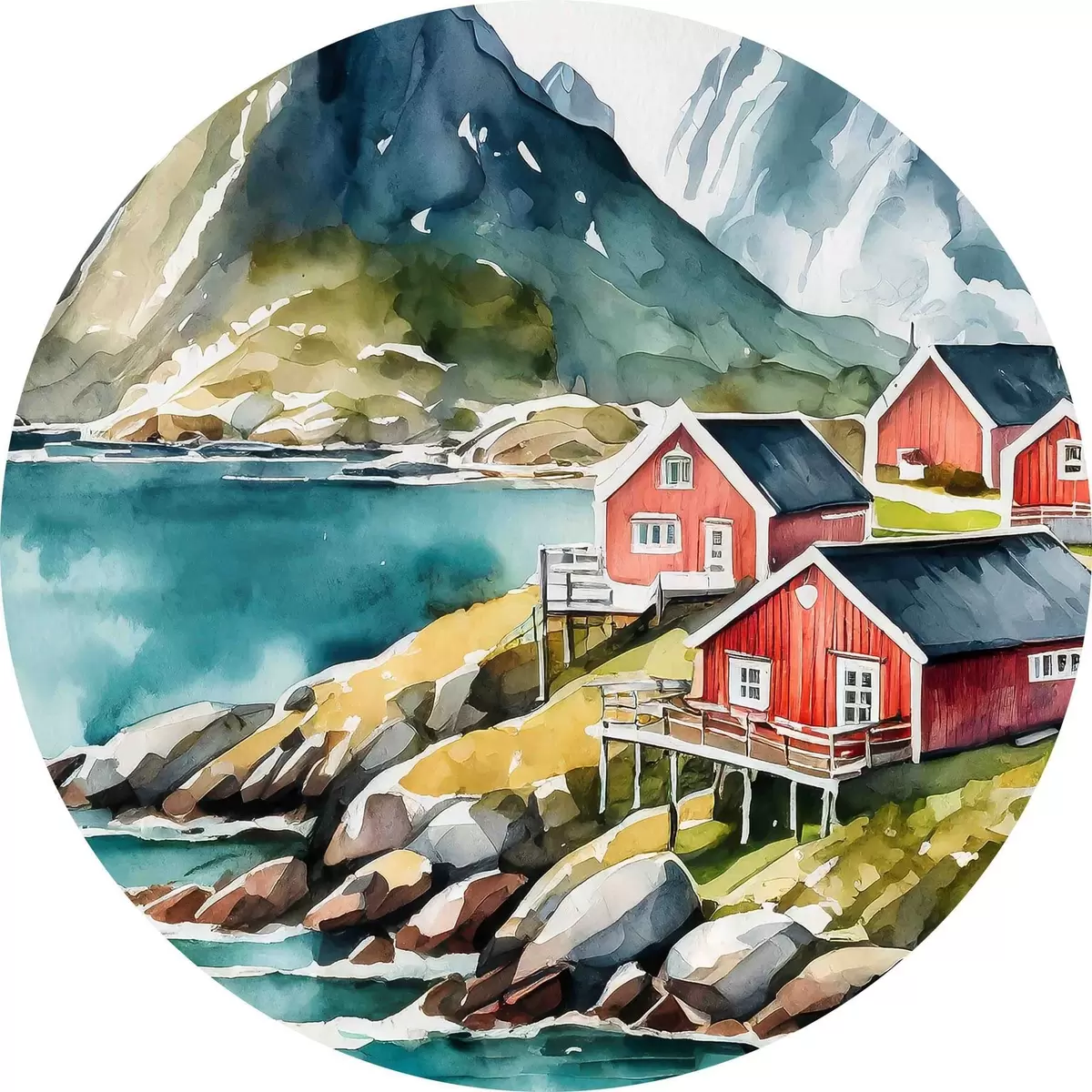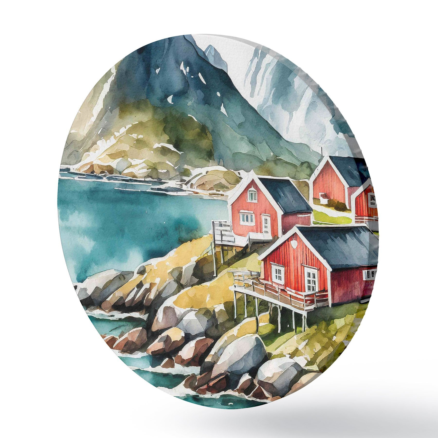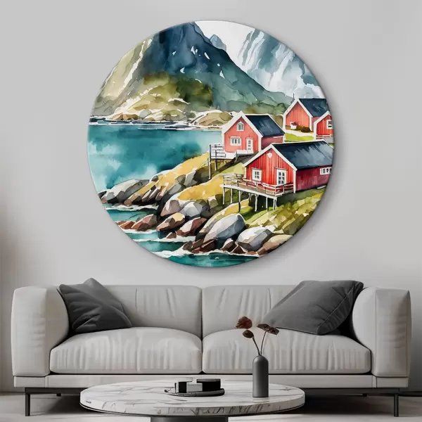 Tableaux ronds Aquarelle de maisons sur une colline près d'un réservoir r36678