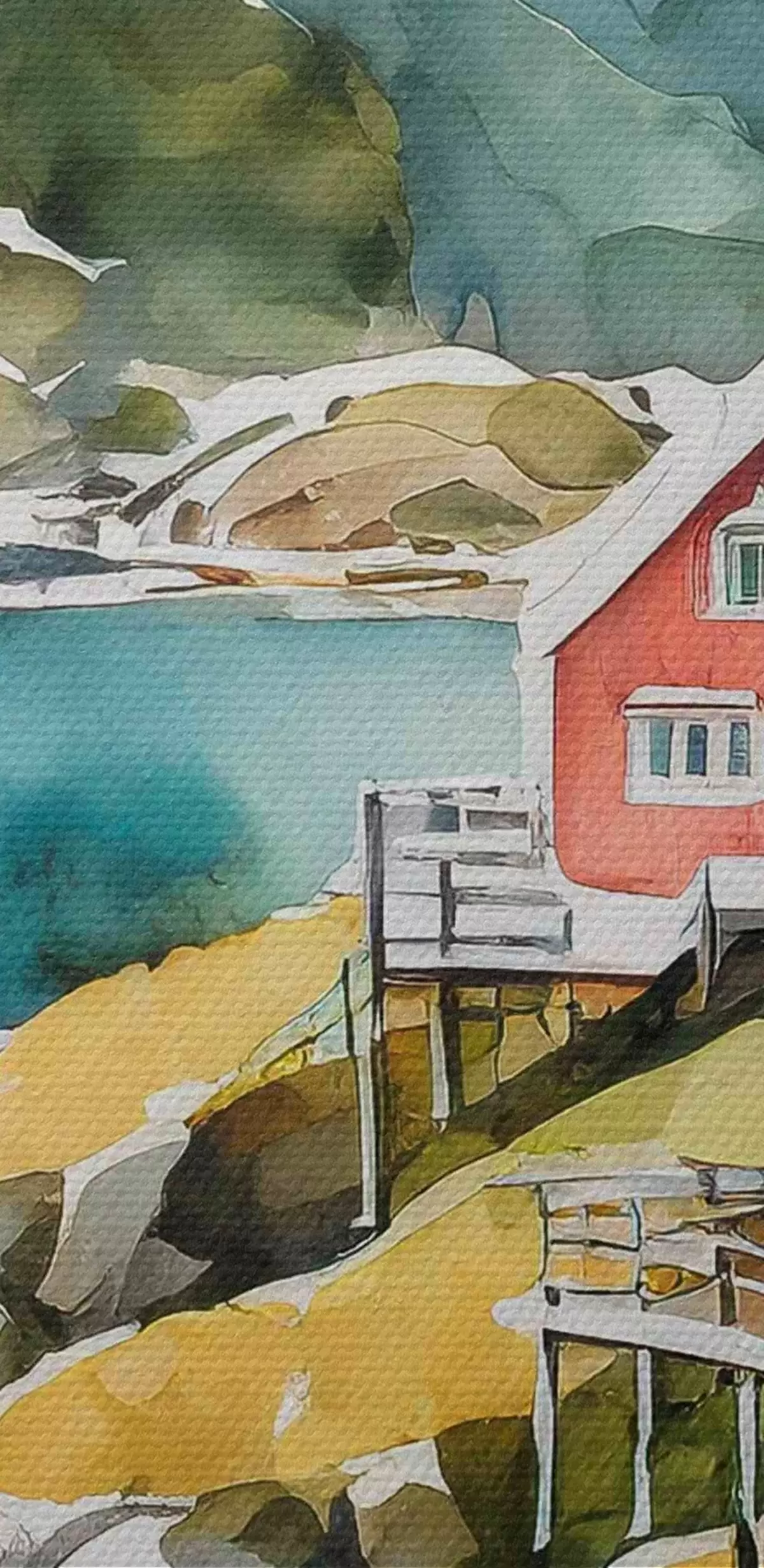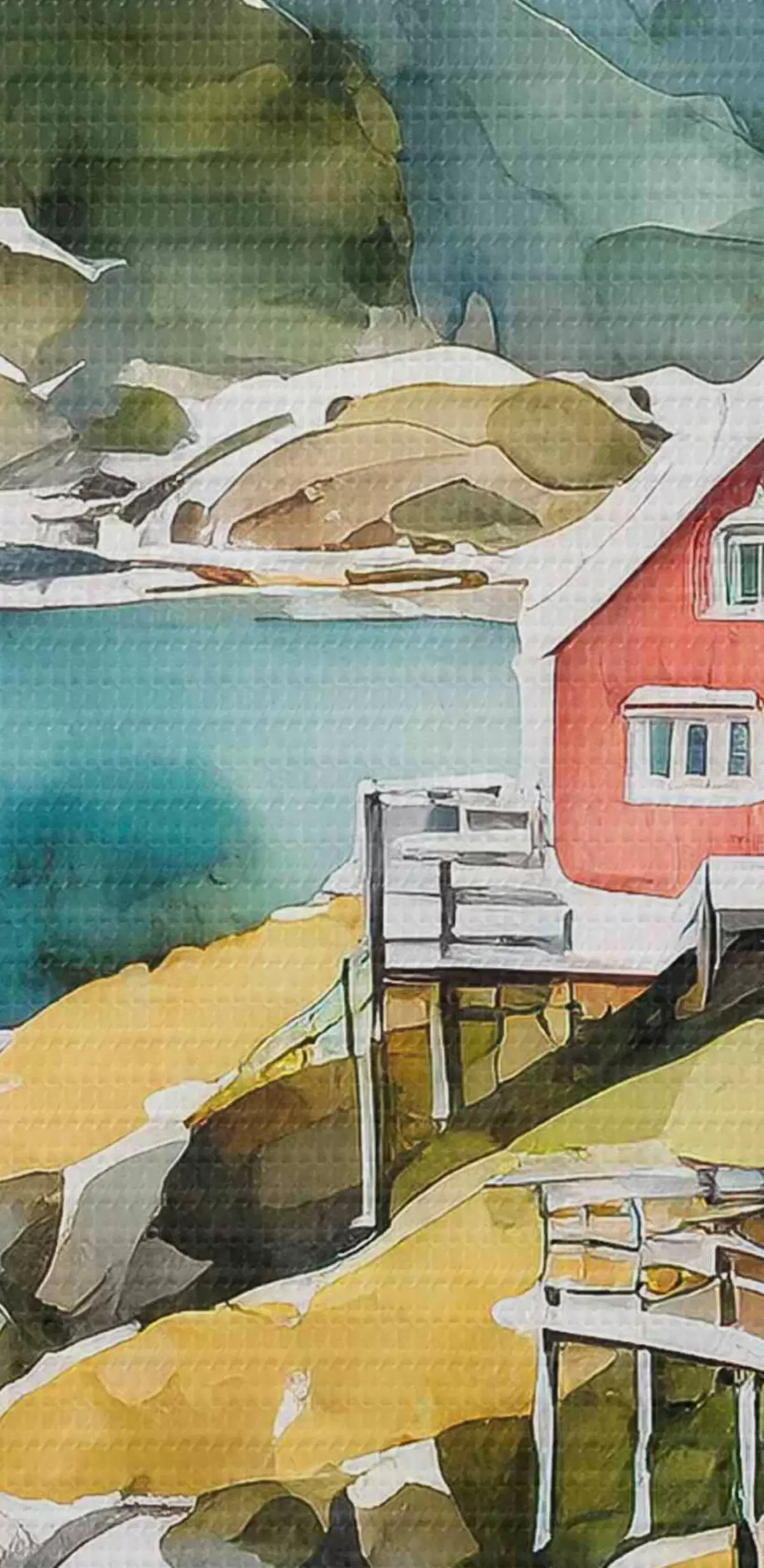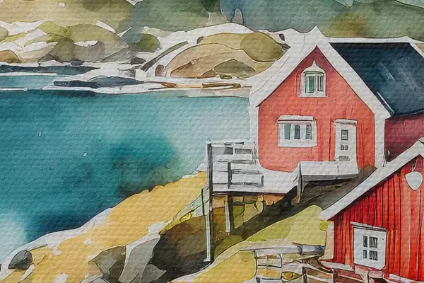 Image Aquarelle de maisons sur une colline près d'un réservoir Nr r36678