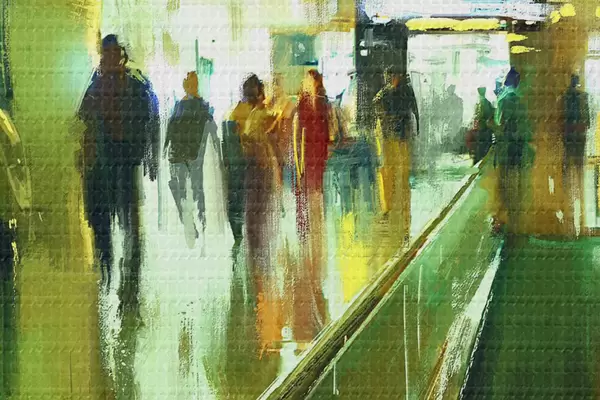 Tableaux ronds Un groupe de personnes marchant sur un escalator r37103