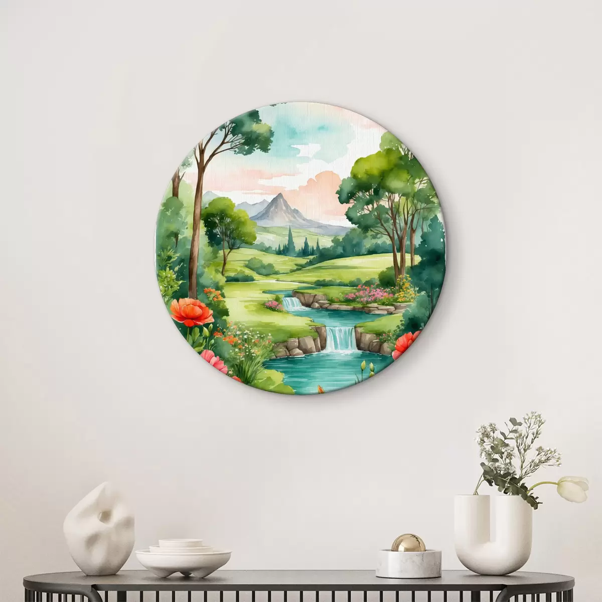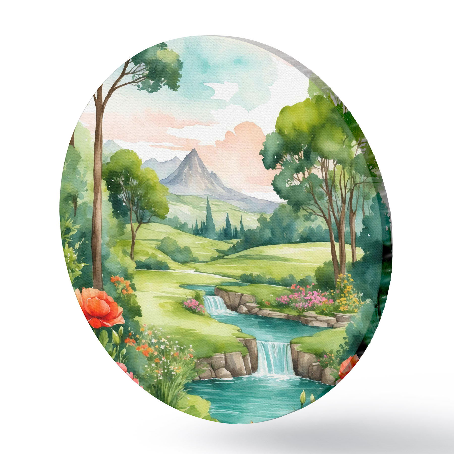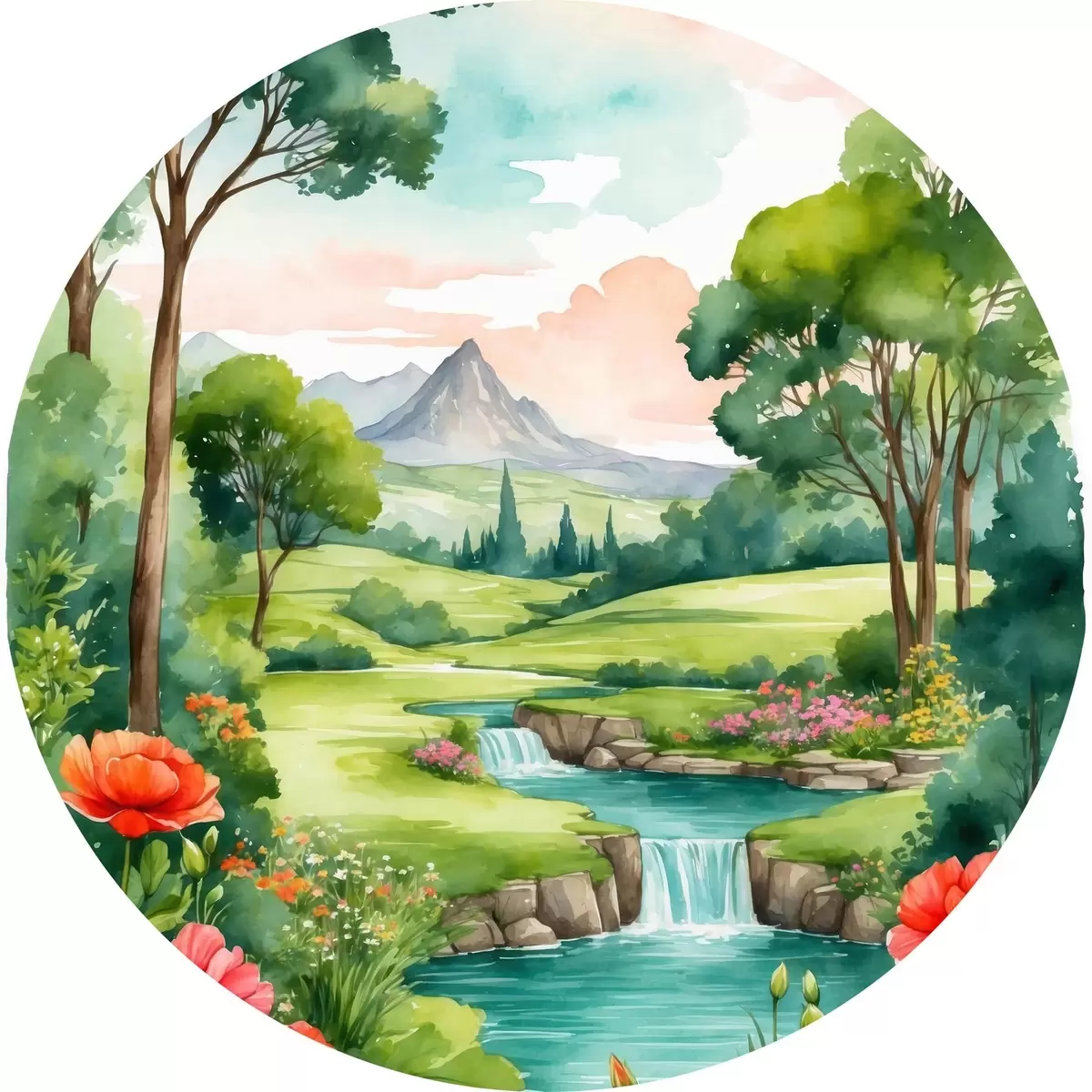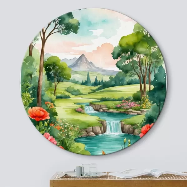 Tableaux ronds Aquarelle représentant une rivière et des fleurs r37116